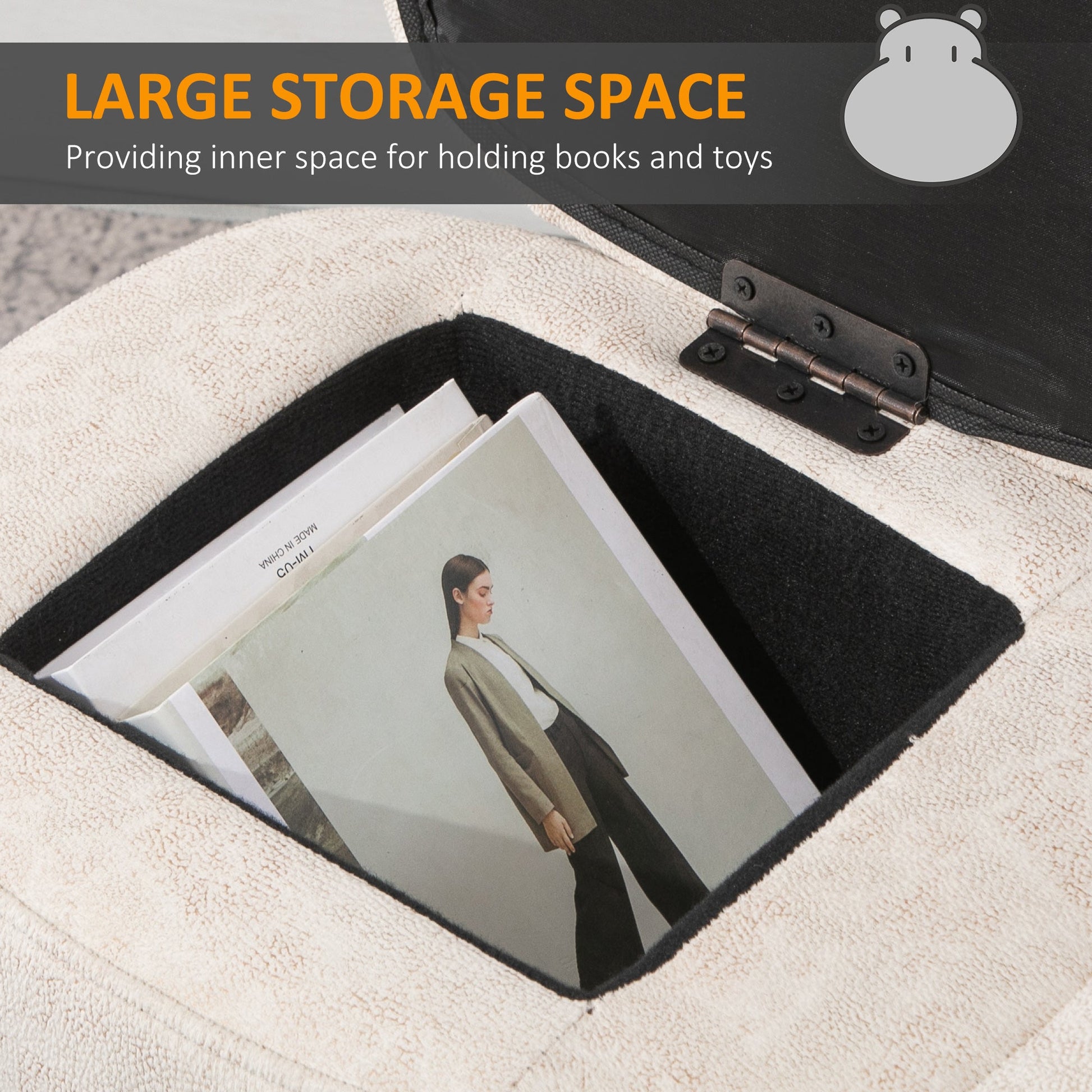 HOMCOM Hippo Storage Stool Cute Decoration Footrest Wood Frame Legs with Padding Lid Ottoman Animal Furniture Cream 36 x 65cm