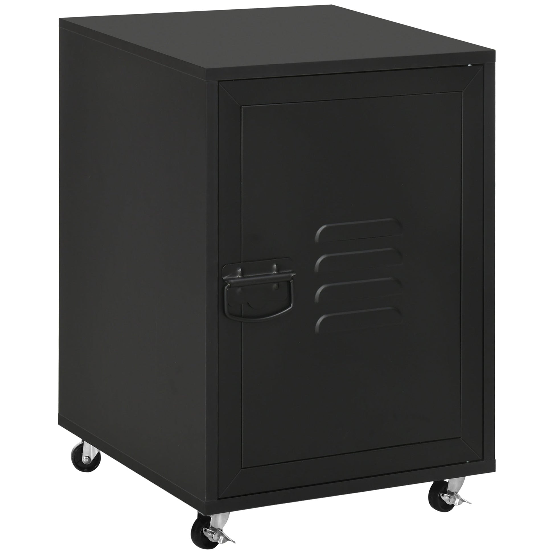 Pure industrial edge for your home or office - this HOMCOM cabinet is cool and quirky. It's a great piece to use as a nightstand, office cabinet or side table, for those looking to do it different this season and beyond. The structure, made from particle board is durable; fitted with a metal door to keep inside guarded. Front air vents for freshness inside. Handle on the front to open the door easily. Completed with four wheels to move around easily.