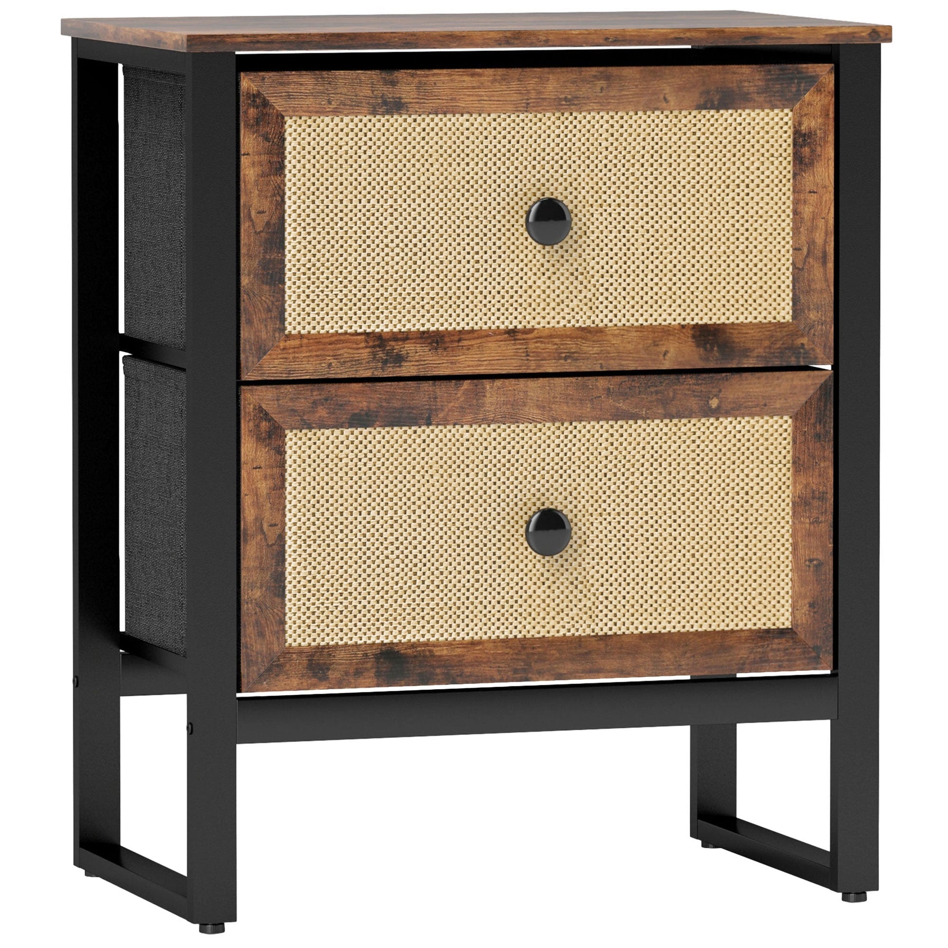Blending the industrial with the natural - this HOMCOM bedside table. With a dark frame and wood-effect body, it comes fitted with two woven panels on the two drawers: this is a bold piece which will bring character into your bedroom. Two drawers offer plenty of space for keeping nighttime essentials close to you. Complete with adjustable feet so it stands balanced.