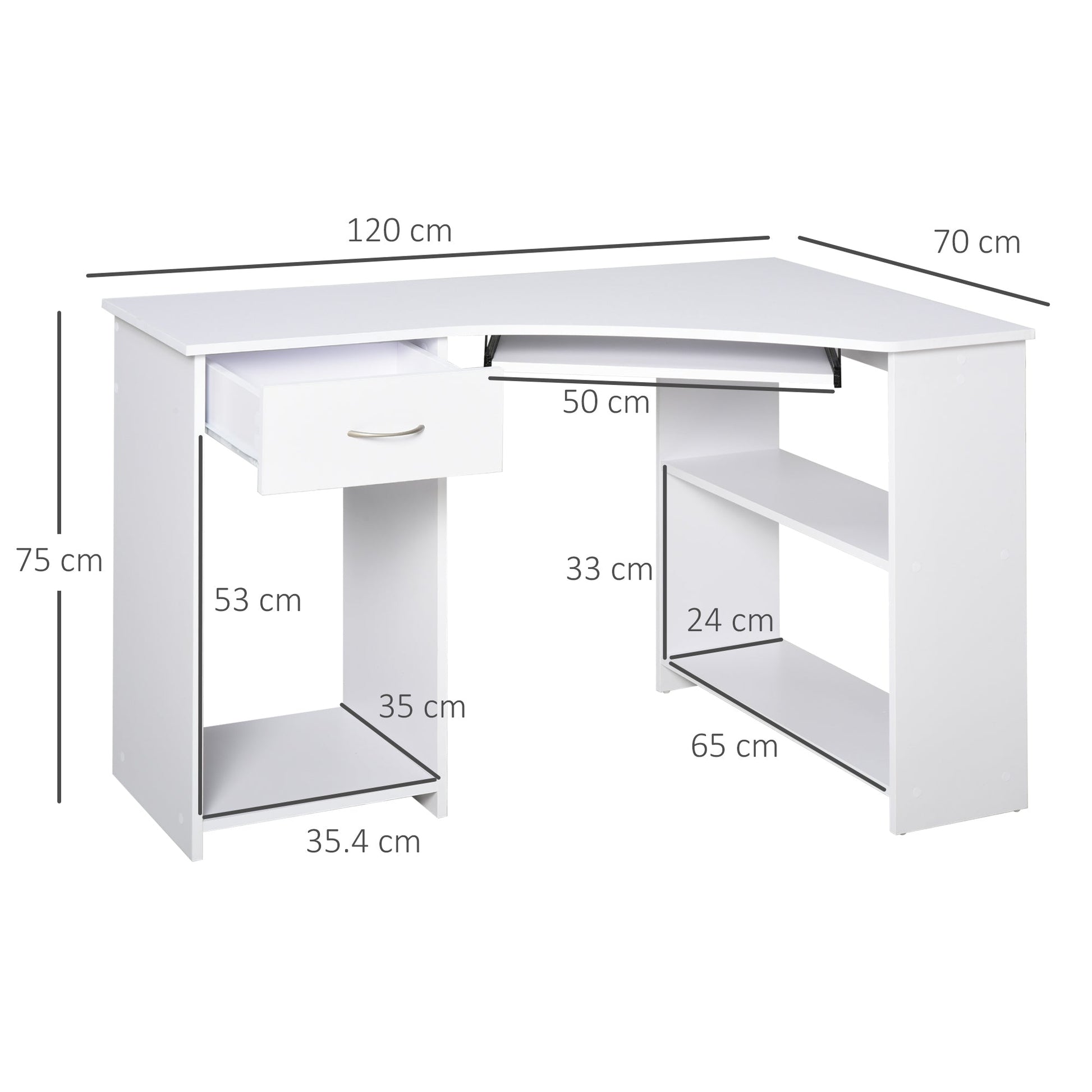 Make the most of those unused corners with this 'L' shaped desk from HOMCOM. This space-efficient piece is made with two wide shelves, an open oblong compartment, a slide-out drawer, keyboard tray and open table top - giving you lots of room needed for working from and keeping your essentials stored. It's made from particle board, meaning the structure is tough and durable so you can use it every day with confidence. It's finished with a smooth melamine coating, which keeps its surface lightly protected and makes it easy to clean. The perfect place to focus your attention all day long.