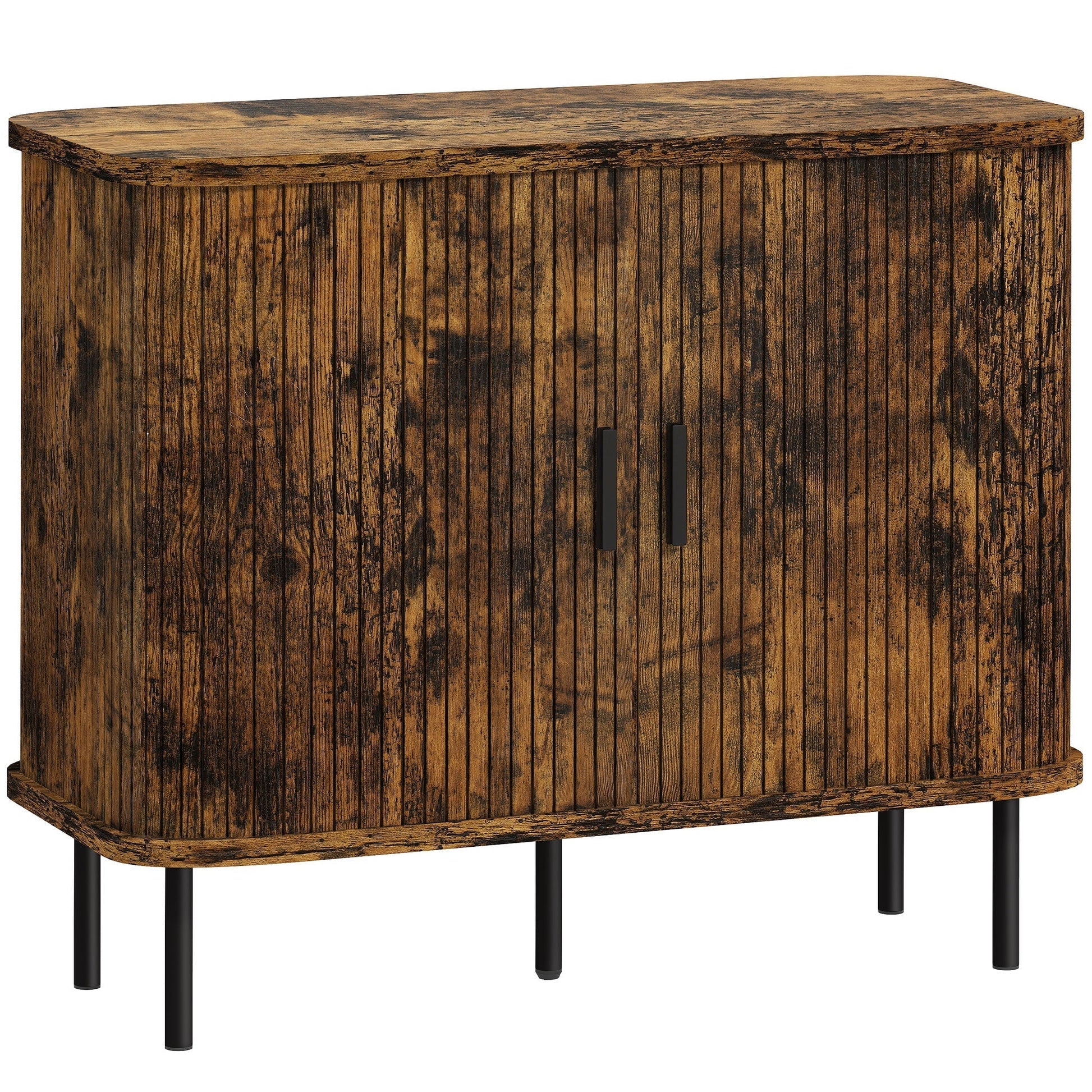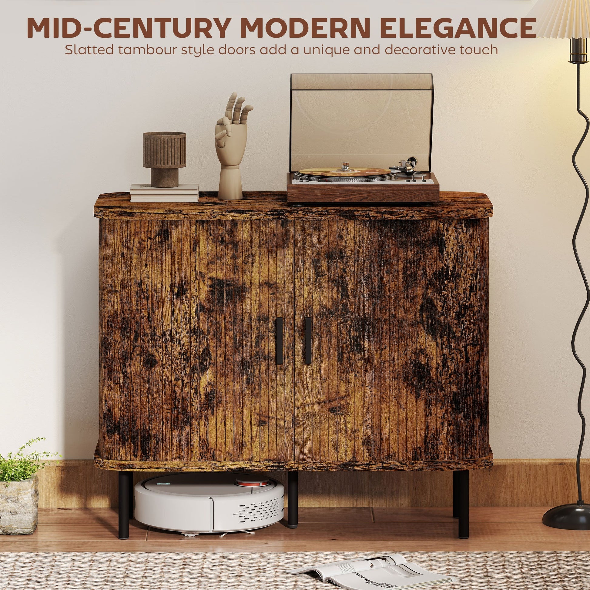 HOMCOM Mid-Century Modern Sideboard Storage Cabinet with Slatted Tambour Sliding Doors, Kitchen Cabinet with Steel Legs, Rustic Brown