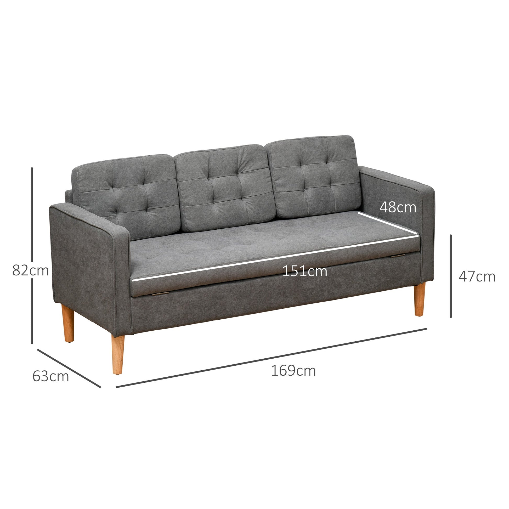 HOMCOM Modern 3 Seater Sofa with Hidden Storage, 169cm Tufted Cotton Couch with Wood Legs, Compact Sofa for Living Room, Grey