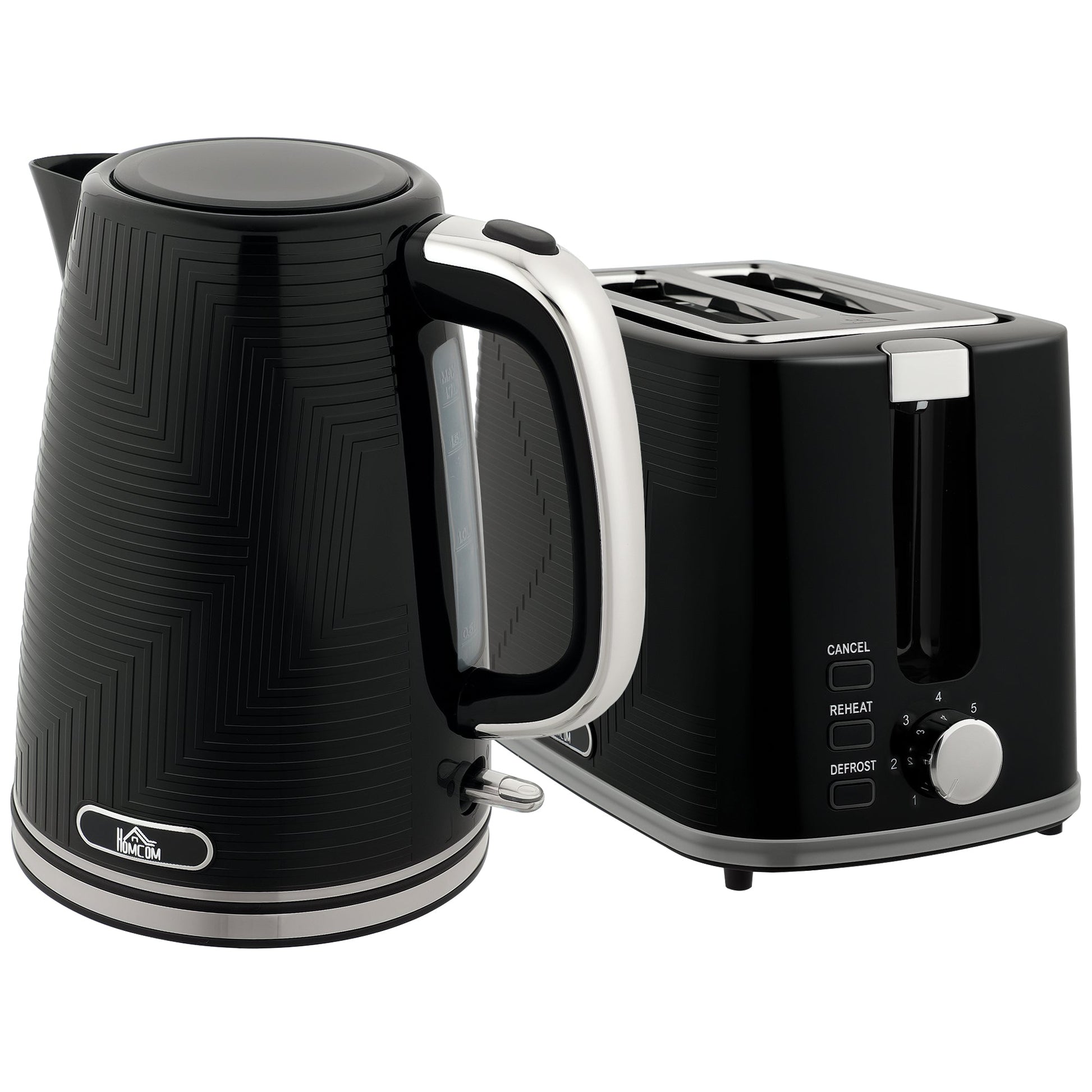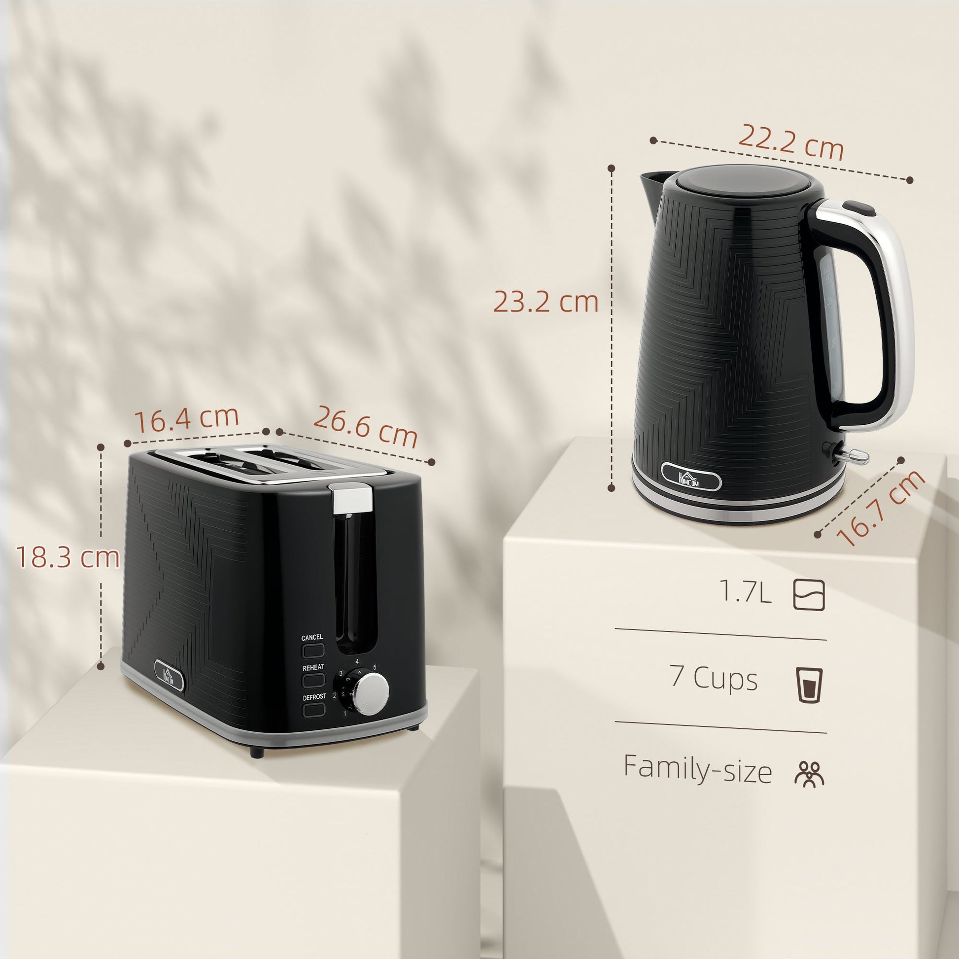 A simple, sleek addition to worktops with this HOMCOM toaster and kettle set. Gently curved, textured all over and with glowing lights, this set looks great as part of your appliance collection. The 1.7L kettle with Otter thermostat delivers fast, precise boiling, plus with safety features (auto shut-off, boil-dry and overheat protection) for peace of mind. The two-slot toaster has seven browning levels, for perfect toast every time.