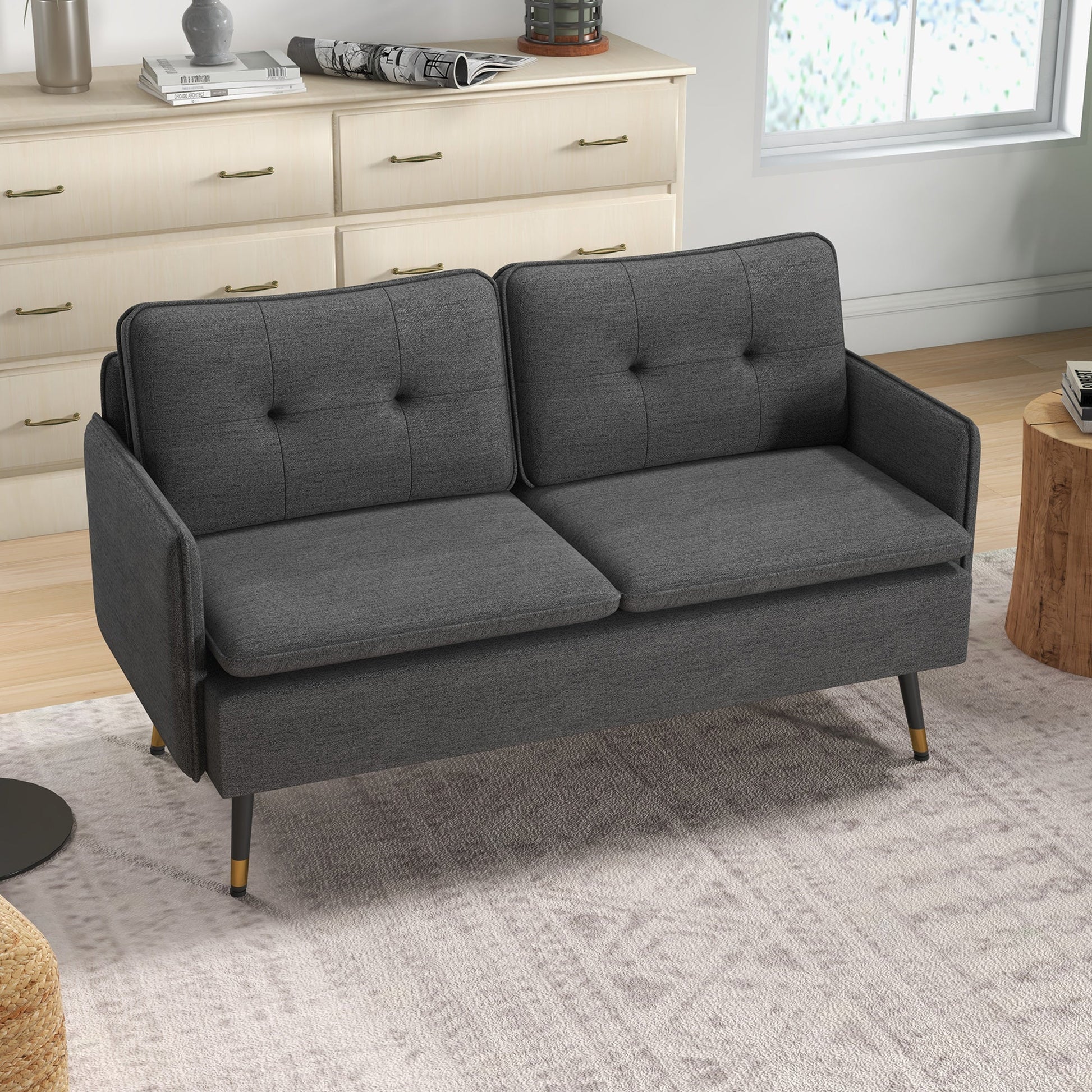 A compact sofa which doesn't scrimp on the comfort - this sofa for living room from HOMCOM. Its breathable linen-look upholstery is smooth on the skin, with the padded seat and back cushions for comfort. Button tufting on the back and gold coloured details on the legs for style. Complete with steel legs for strong support.