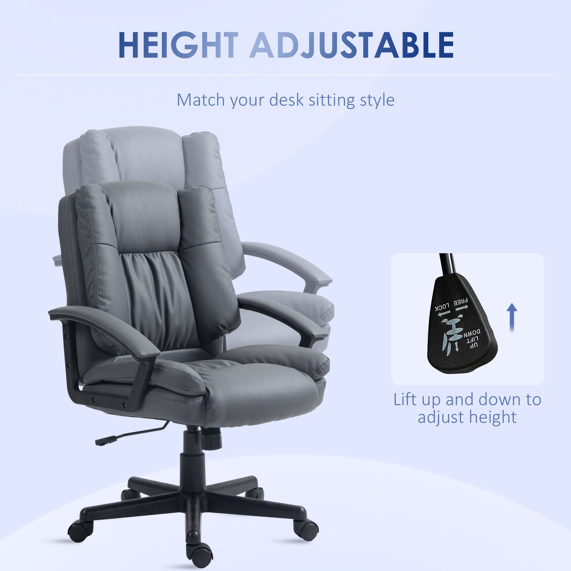 This HOMCOM office chair is a great addition to any home office. A comfy chair: filled with foam padding, with a high back, fixed armrests and adjustable height for support. Five 360 wheels allow this chair to be moved around easily, whenever, complete with a swivel seat which moves in motion with your body.