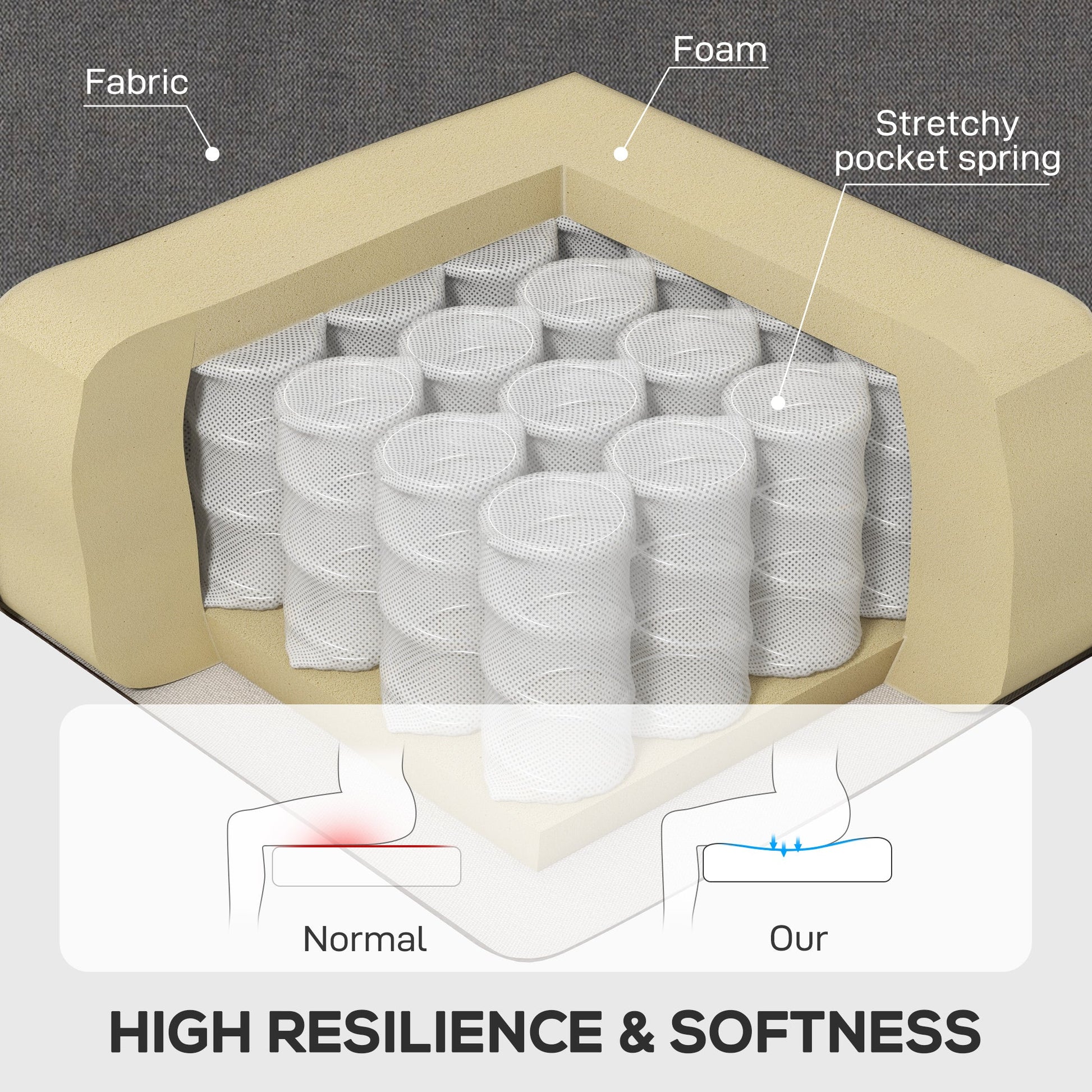 - Thick foam padding and pocket springs for comfort and support