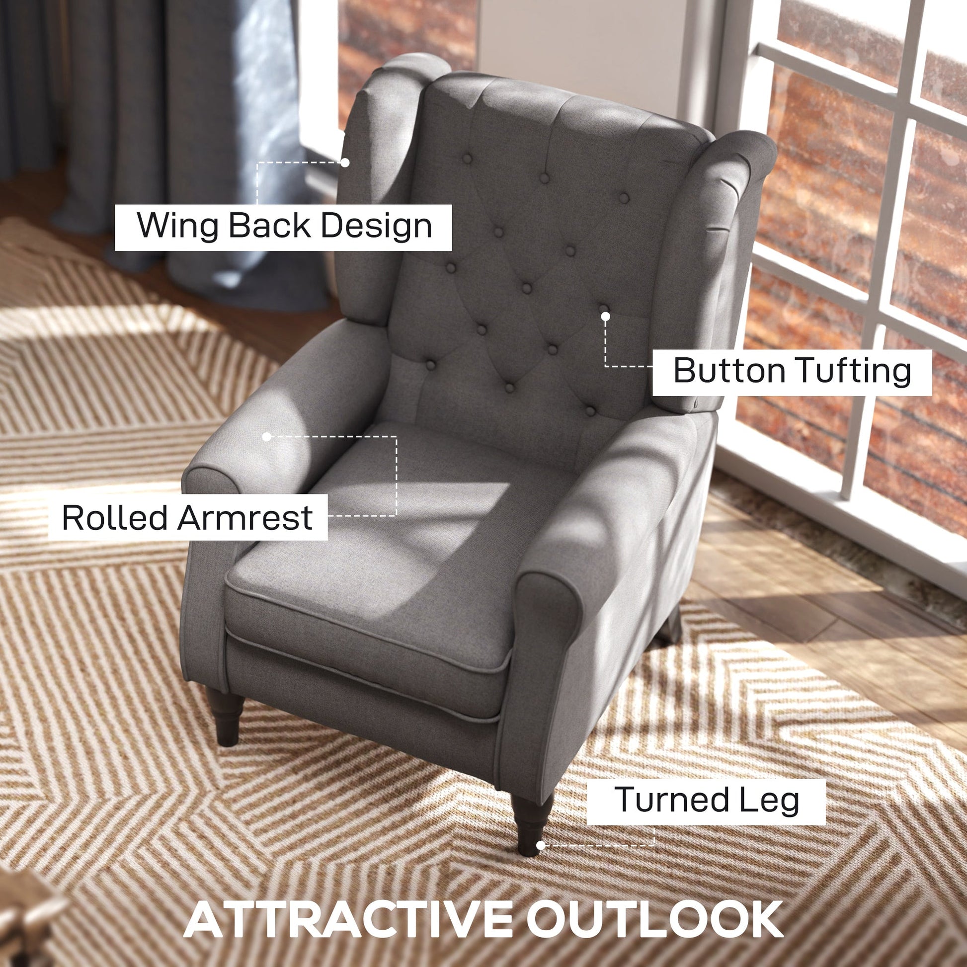 HOMCOM Retro Accent Chair, Linen Wingback Armchair with Wood Frame Button Tufted Design for Living Room Bedroom, Dark Grey