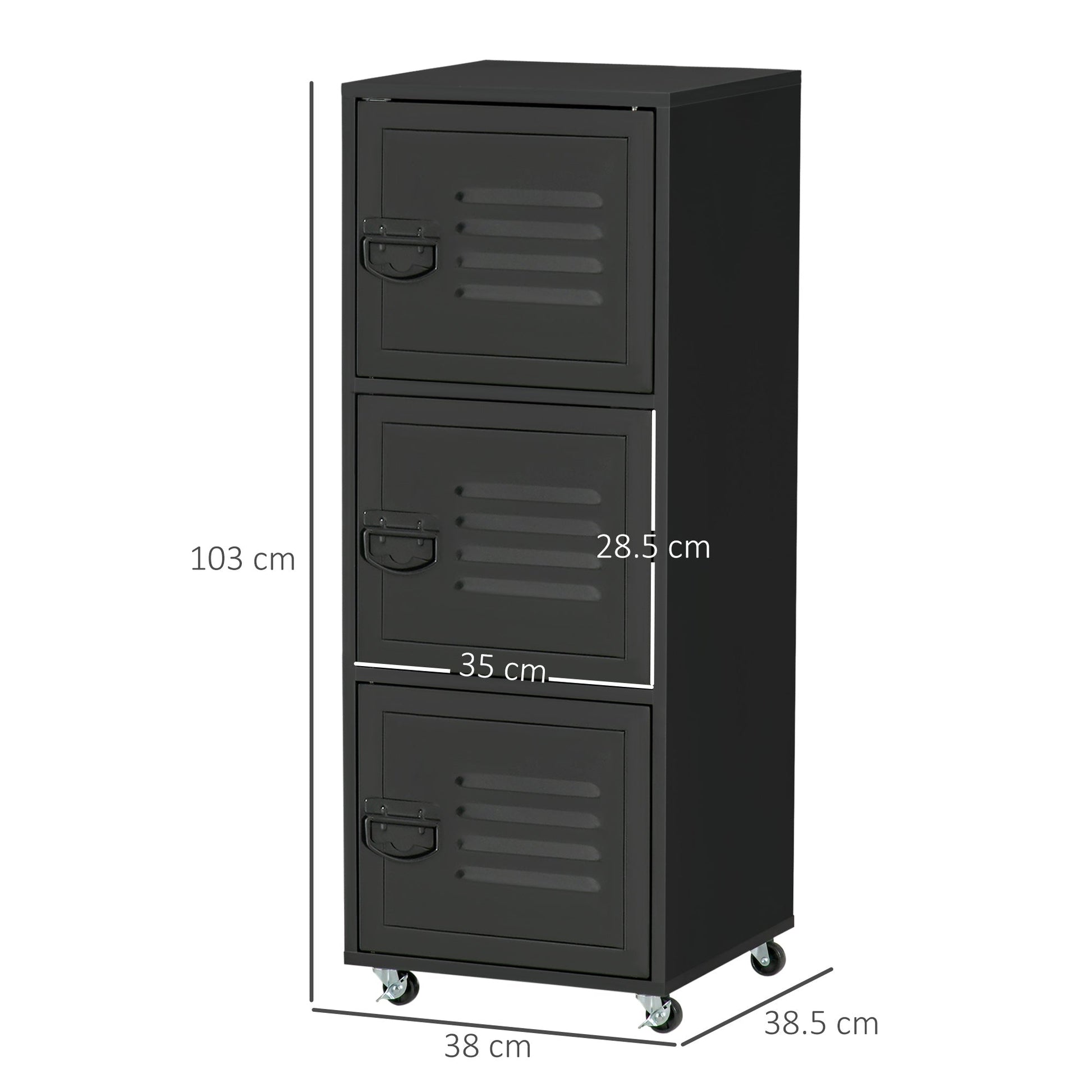 Cool industrial edge for your home or office - this HOMCOM mobile file cabinet with 3 drawers is cool and quirky. It's a great piece to use as a storage cabinet, for those looking to do it differently this season and beyond. The structure, made from particle board is durable; each compartment is fitted with a metal door to keep inside guarded. Front air vents for freshness inside. Handle on the front to open the door easily. Completed with four wheels to move around easily.