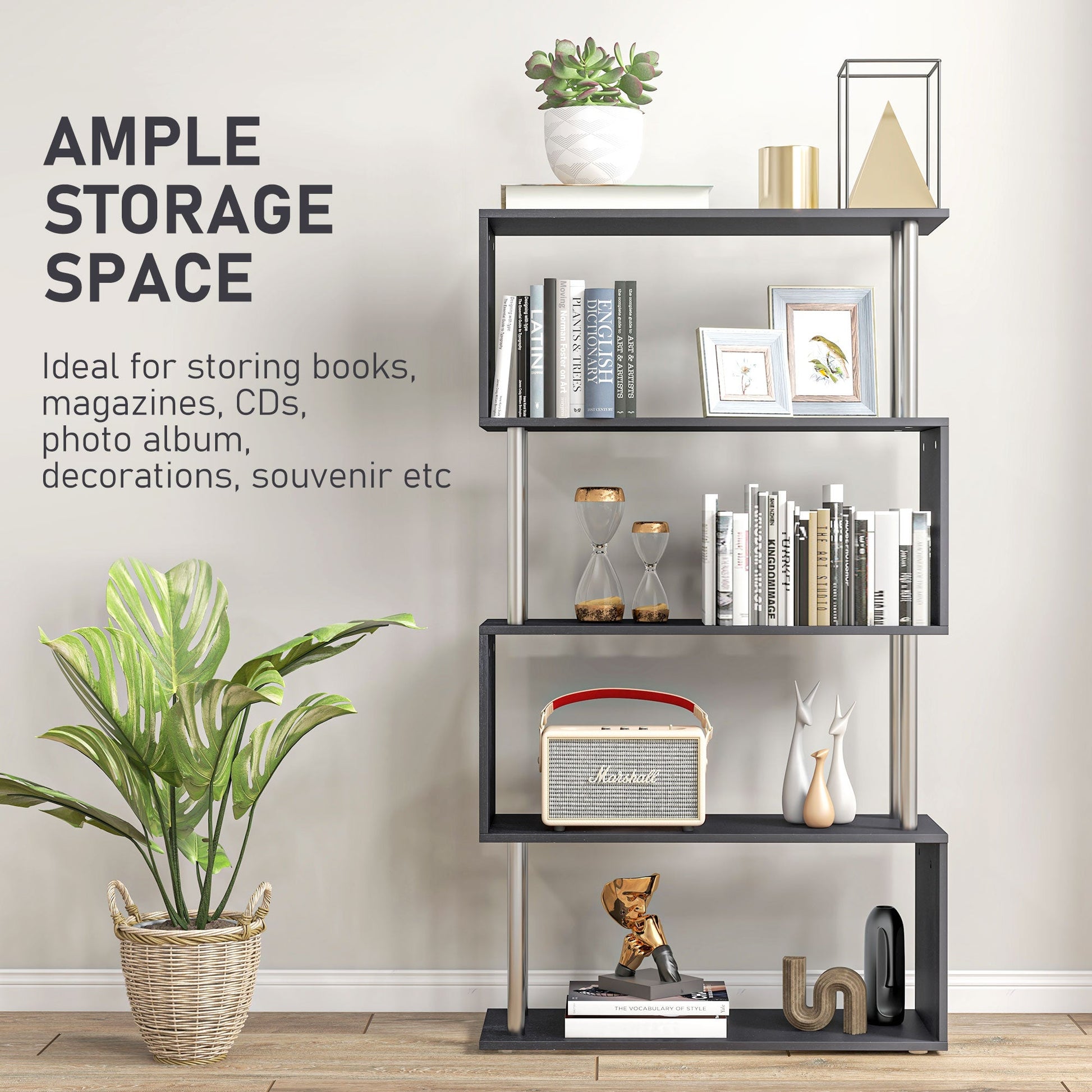 HOMCOM S Shape Bookcase, 5 Tiers Bookshelf, Modern Freestanding Storage Shelf for Home Office, Study, Living Room, 80 x 30 x 145cm Black