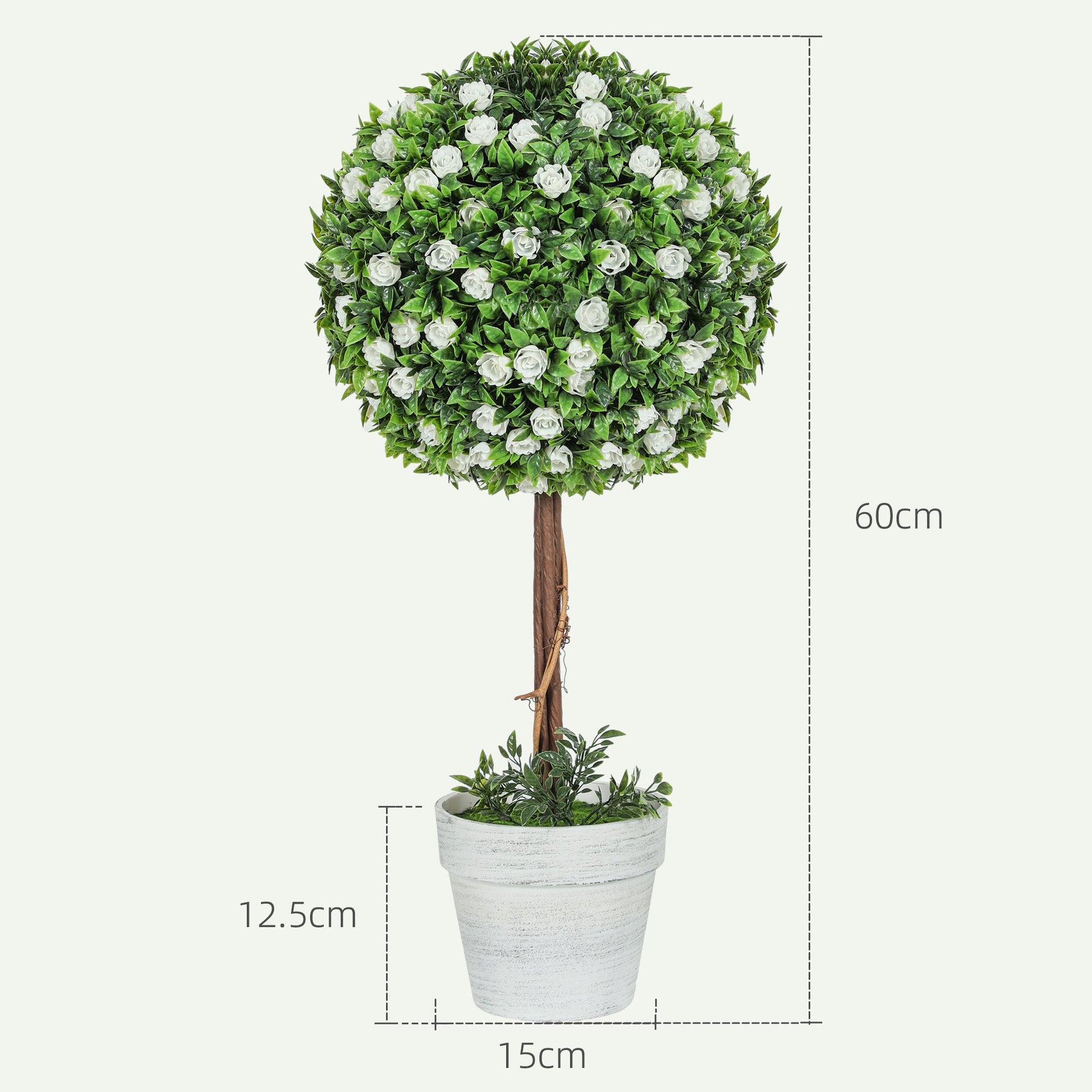 HOMCOM Set of 2 Decorative Artificial Plants, Ball Topiary Tree with Rose Flower in Pot, Fake Plants for Home Indoor Outdoor Decor, 60cm, White