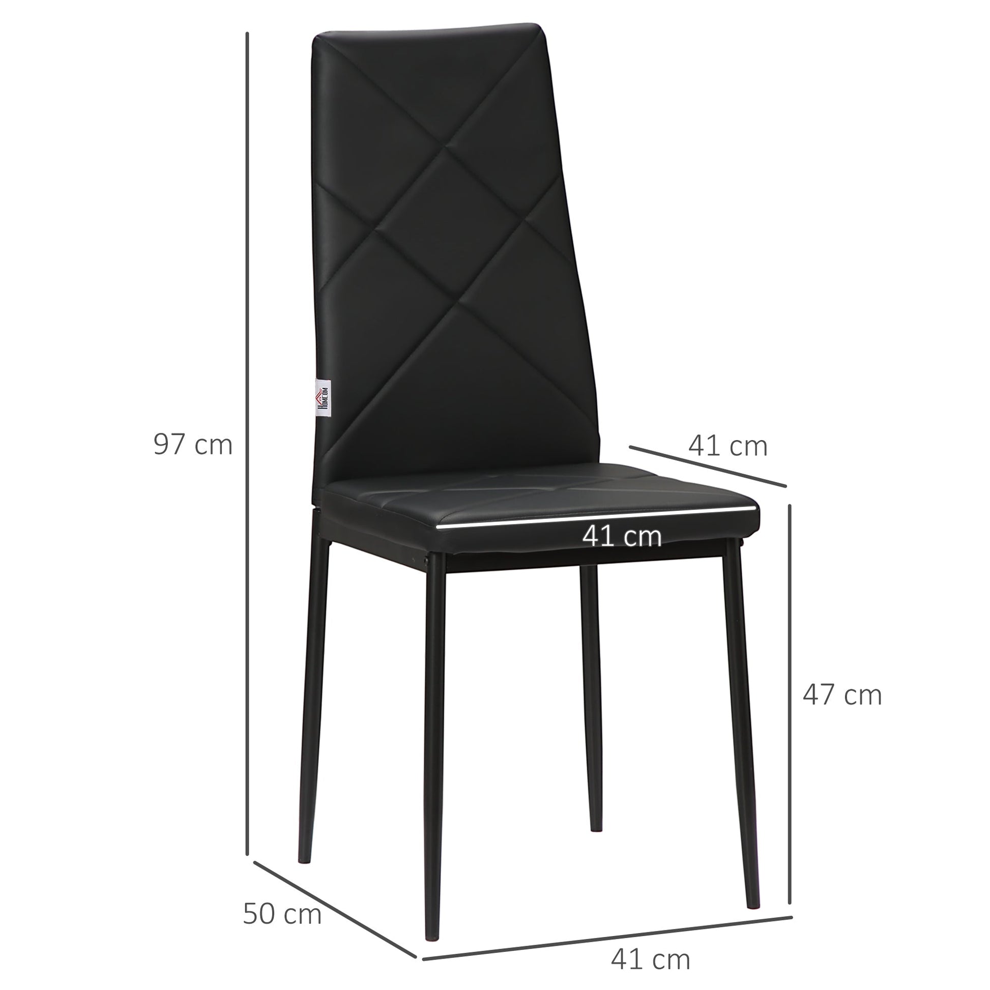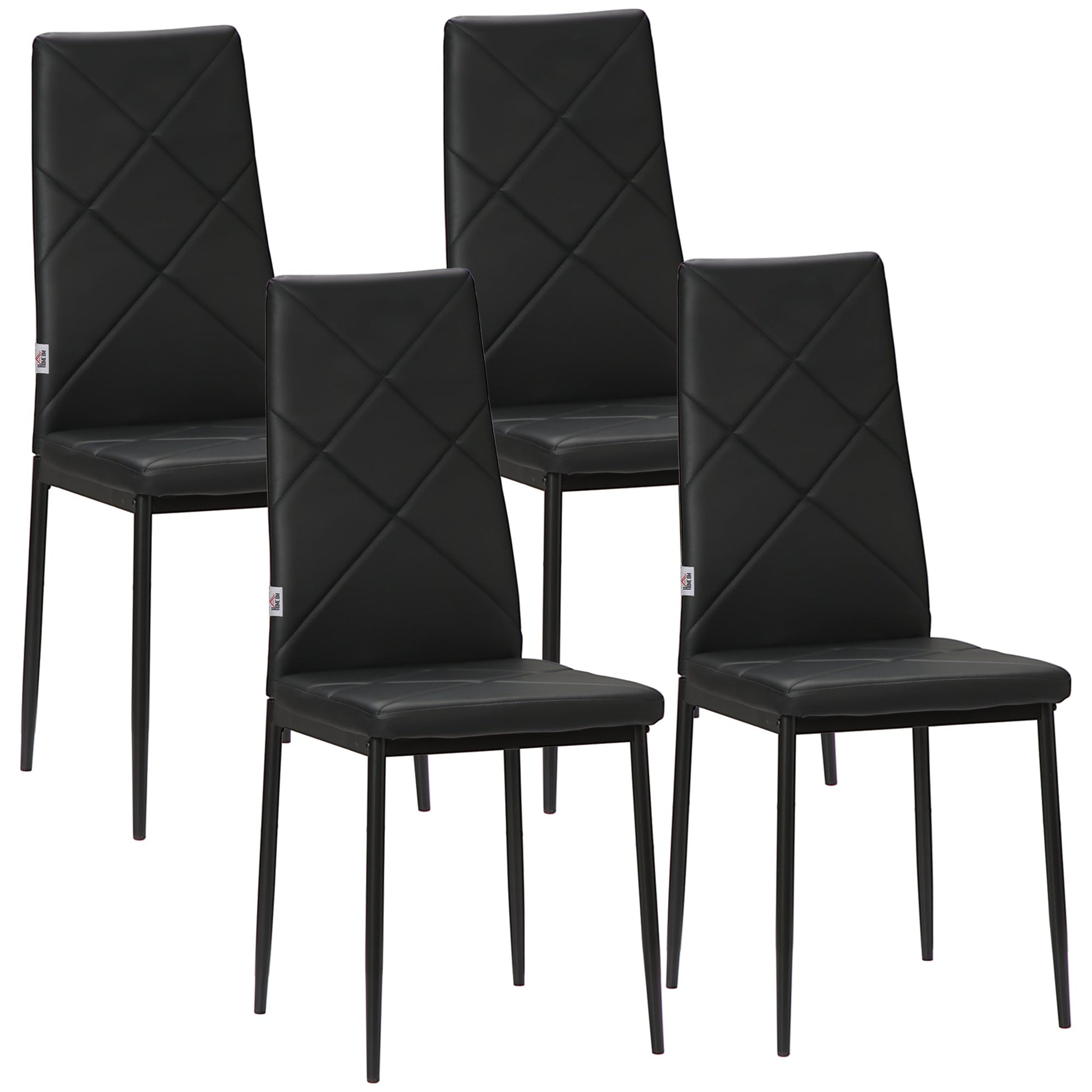 Update your dining room in matching style, with this set of four HOMCOM chairs. With the padded seat for comfort, the high backs keep you supported. These faux leather dining chairs have powder coated steel legs for strong support, for as long as you dine.