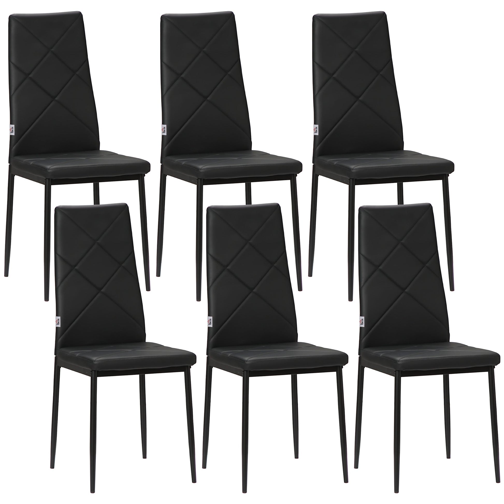 Update your dining room in matching style, with this set of six HOMCOM chairs. With the padded seat for comfort, the high backs keep you supported. These faux leather dining chairs have powder coated steel legs for strong support, for as long as you dine.
