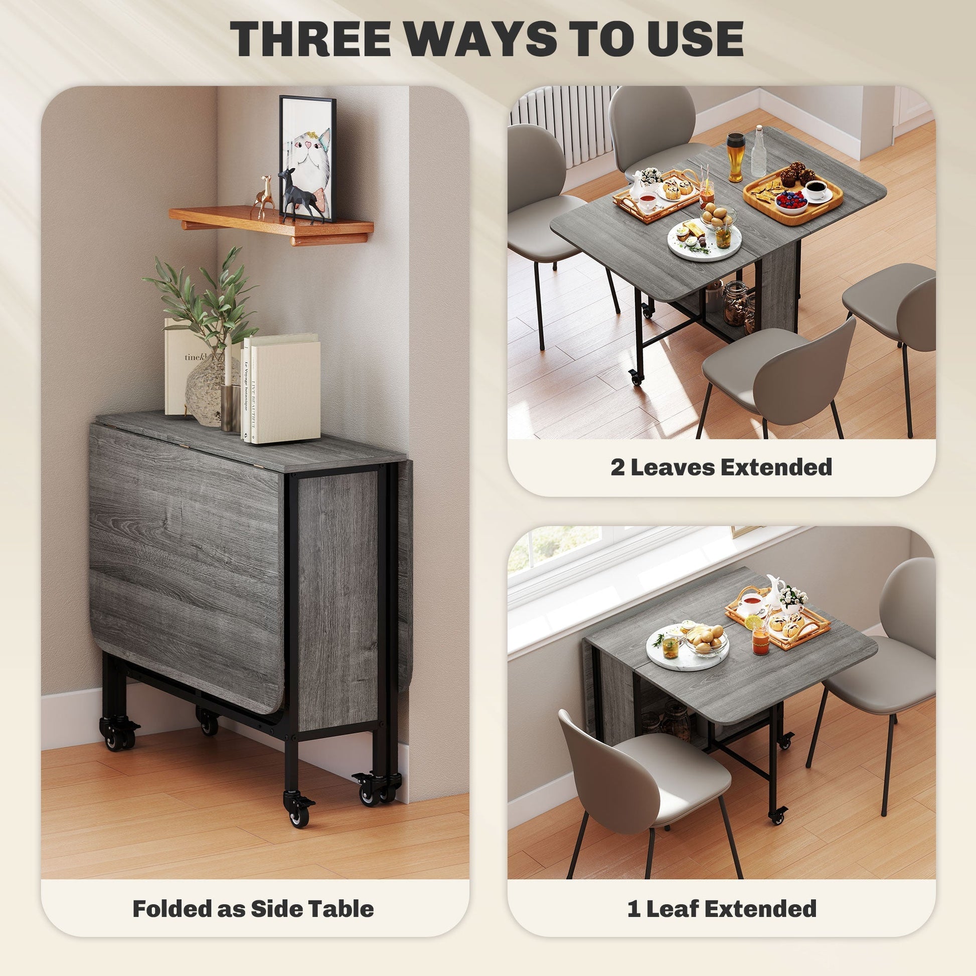 - Two side tabletops lift and stay in place. Can be folded into a small and compact unit when not in use