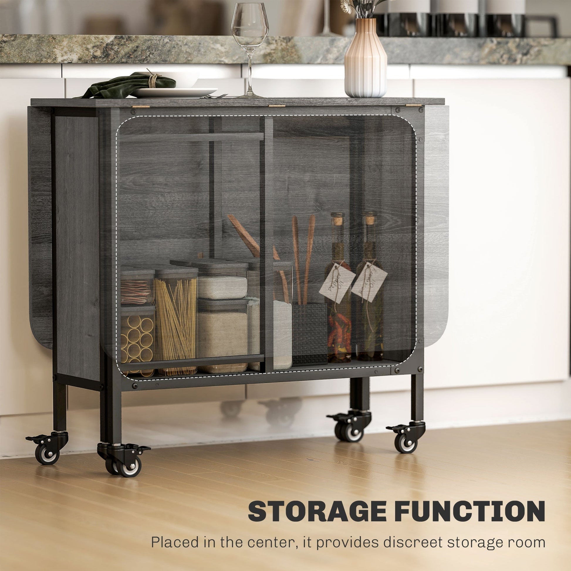 Make large unused tables at home a thing of the past. Choose this folding dining table from HOMCOM for an option that saves space when needed. Crafted into an expandable design, where both sides lift from the bottom; it creates extra surface room while dropping back down into a compact unit effortlessly. It comes with a middle shelf for discreet storage and six wheels to move easily. Completed with brakes.
