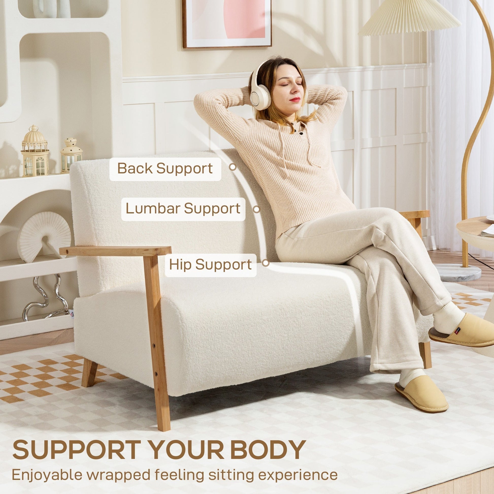 - Sherpa fabric cover offers a plush, cosy feel. Rubber wood armrests and legs add a touch of elegance