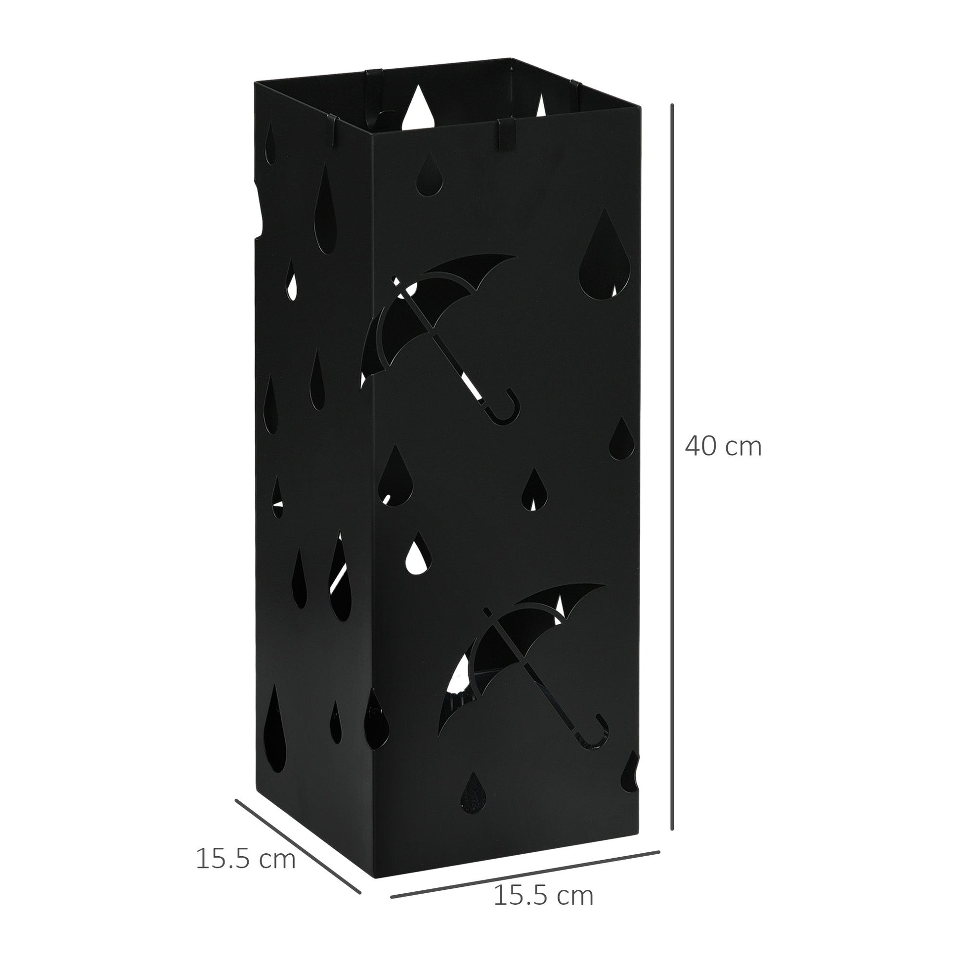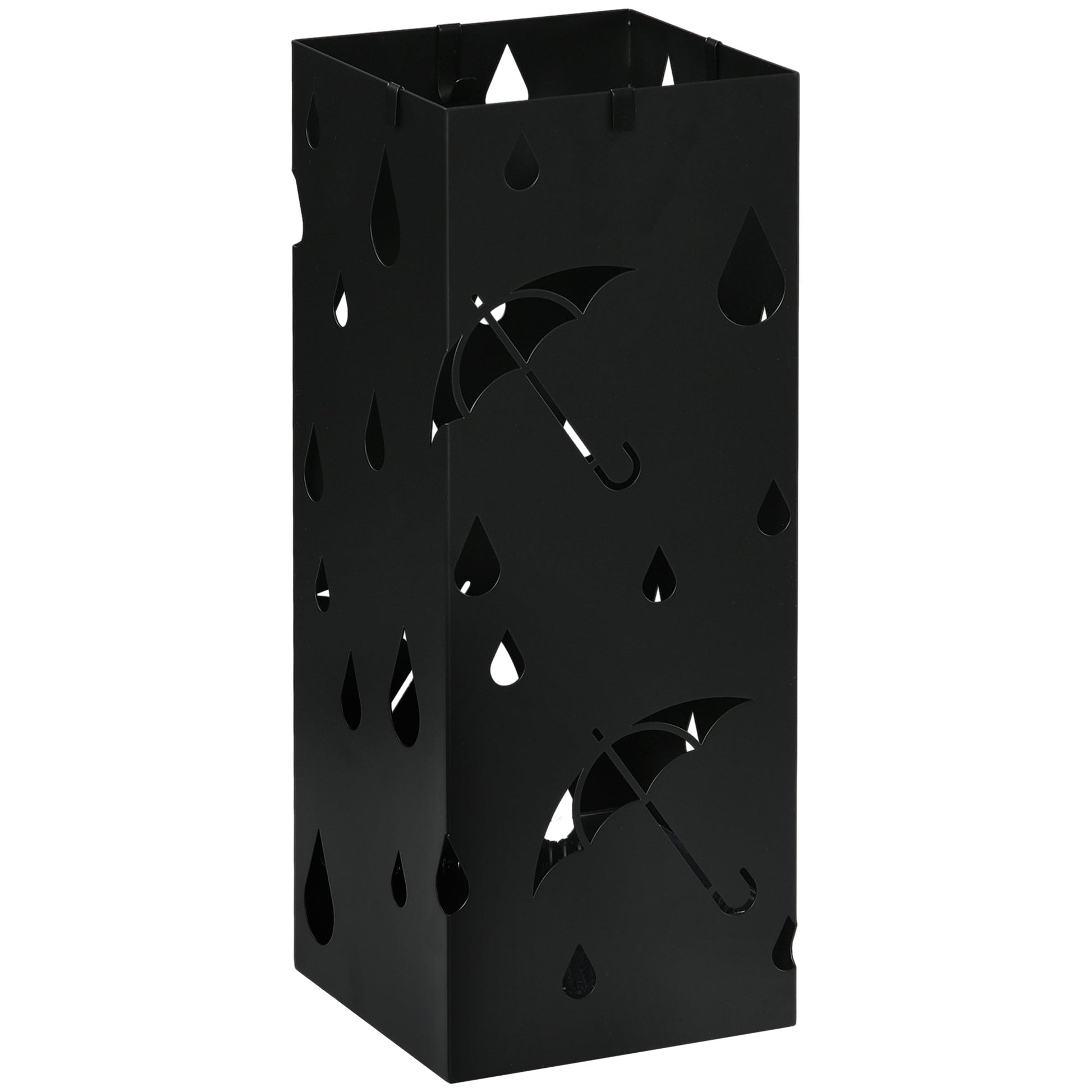 HOMCOM Steel Umbrella Stand, Square Umbrella Holder with 4 Hooks and Removable Drip Tray, Hollowed Umbrella Basket for Hallway, Black