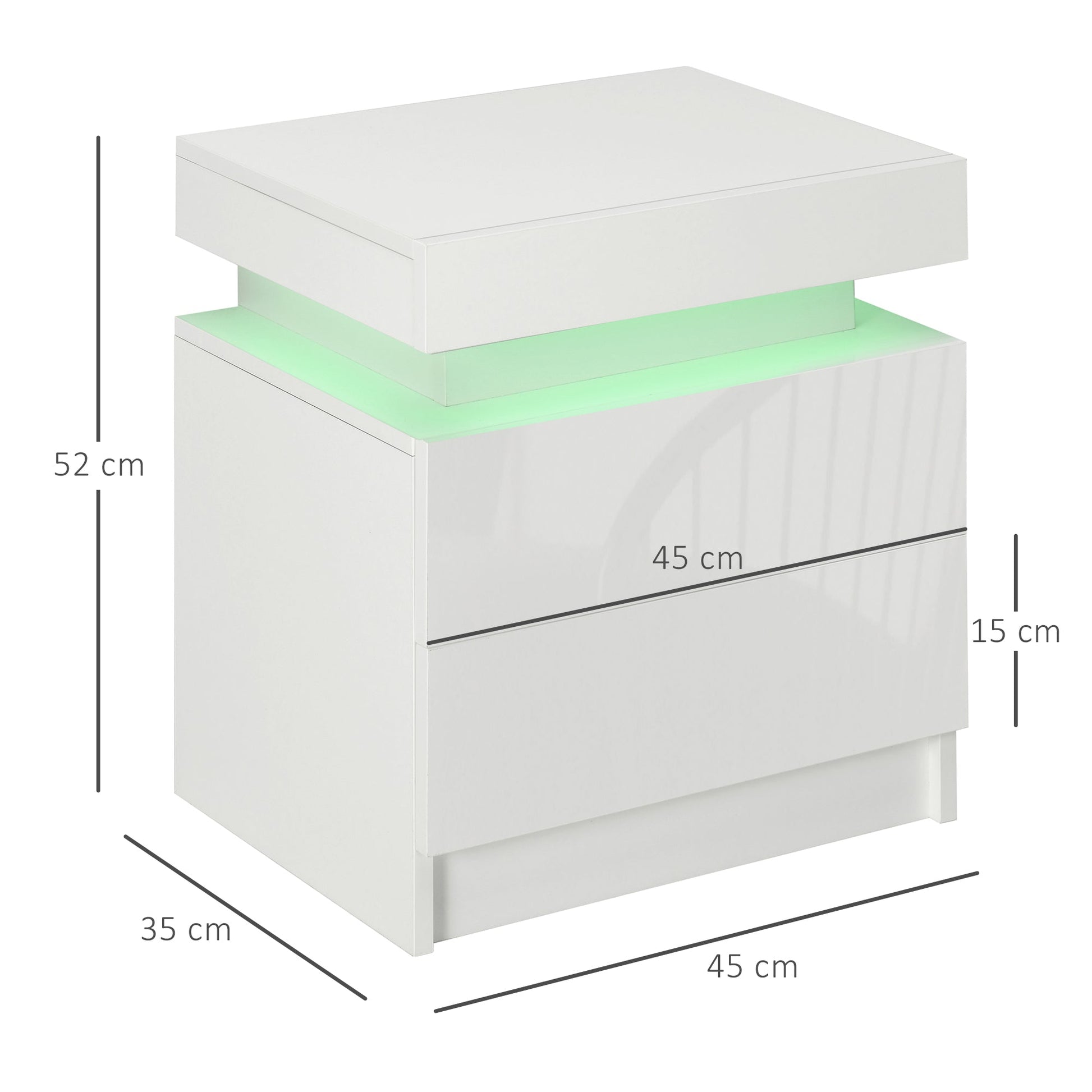 Light up the night in cool style: look to this HOMCOM bedside table. It comes with a middle LED panel: 16 different colours and four different modes mean you can create different moods and feelings at the touch of the remote. It comes with two drawers so there's room for keeping night time essentials close to you. Made from sturdy particle board, finished in high gloss for a stylish and modern look.