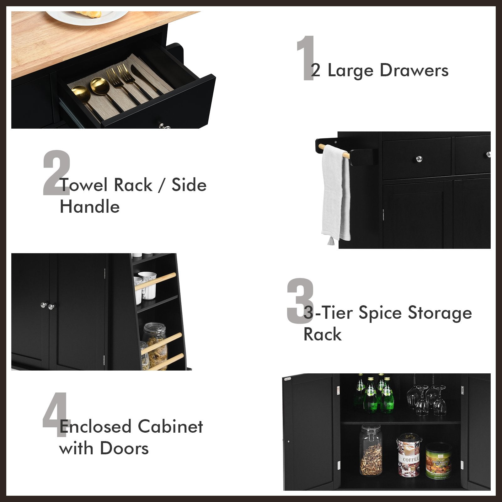 Kitchen Island with Rubber Wood Countertop and Storage on Wheels-Black