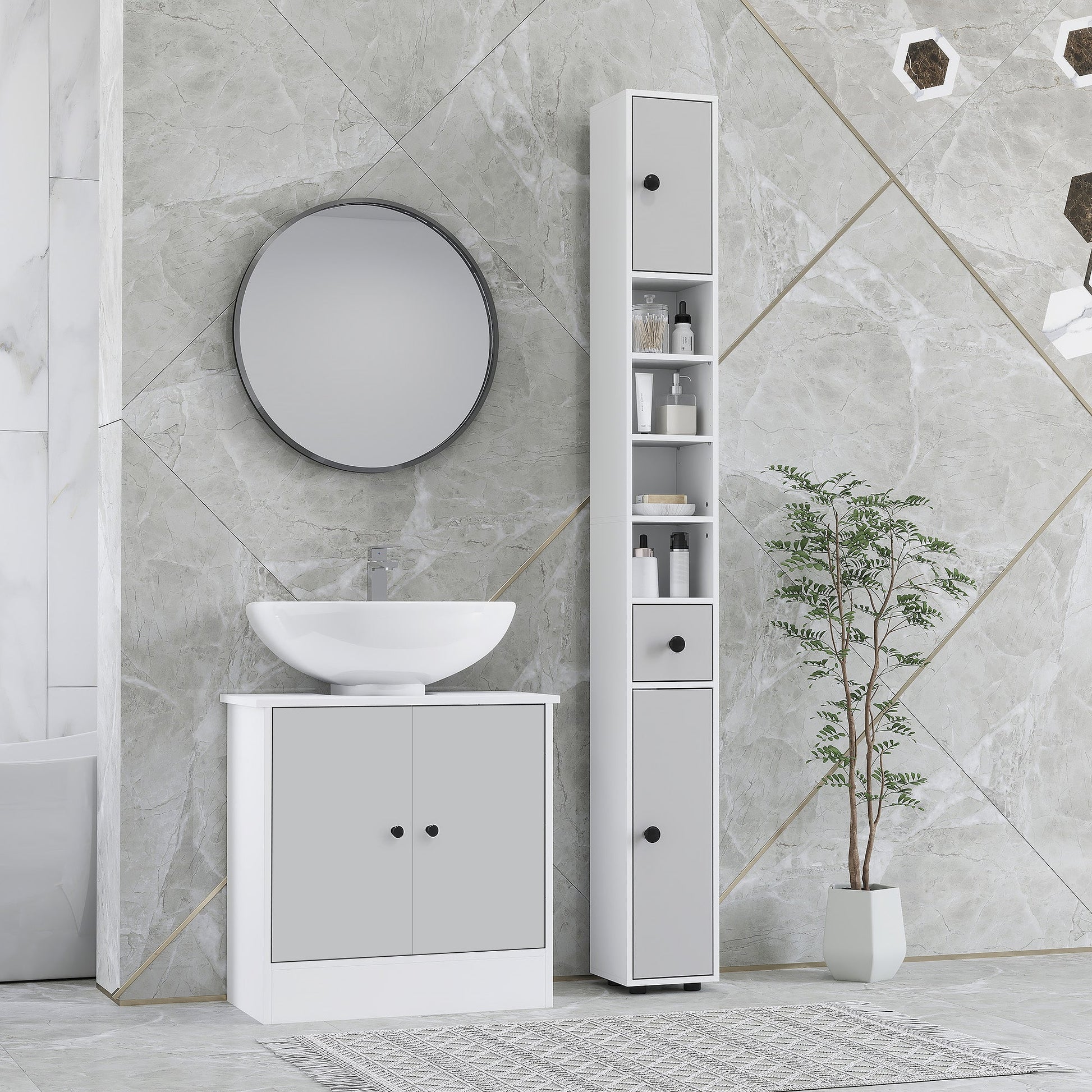 kleankin 180cm Slim Bathroom Cabinet, with Drawer, Shelves and Cupboards - Light Grey