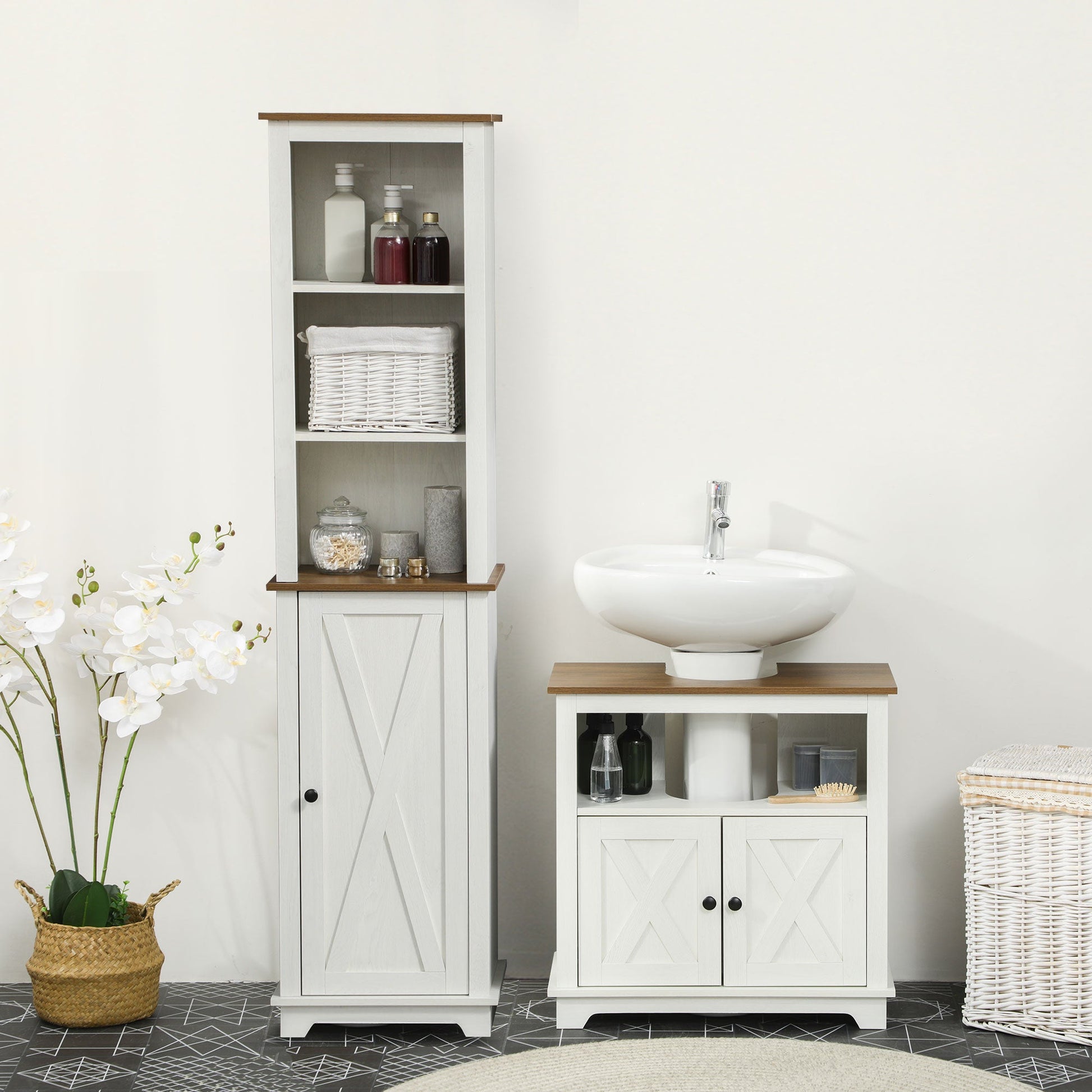 Discover the charm of the kleankin bathroom furniture set, blending farmhouse flair with functionality. This set features a tall bathroom cabinet with three open shelves and a cupboard with door, alongside an under sink cabinet, excellent for tucking away essentials. With a rustic wood effect finish, it's a space-saving addition to any bathroom.