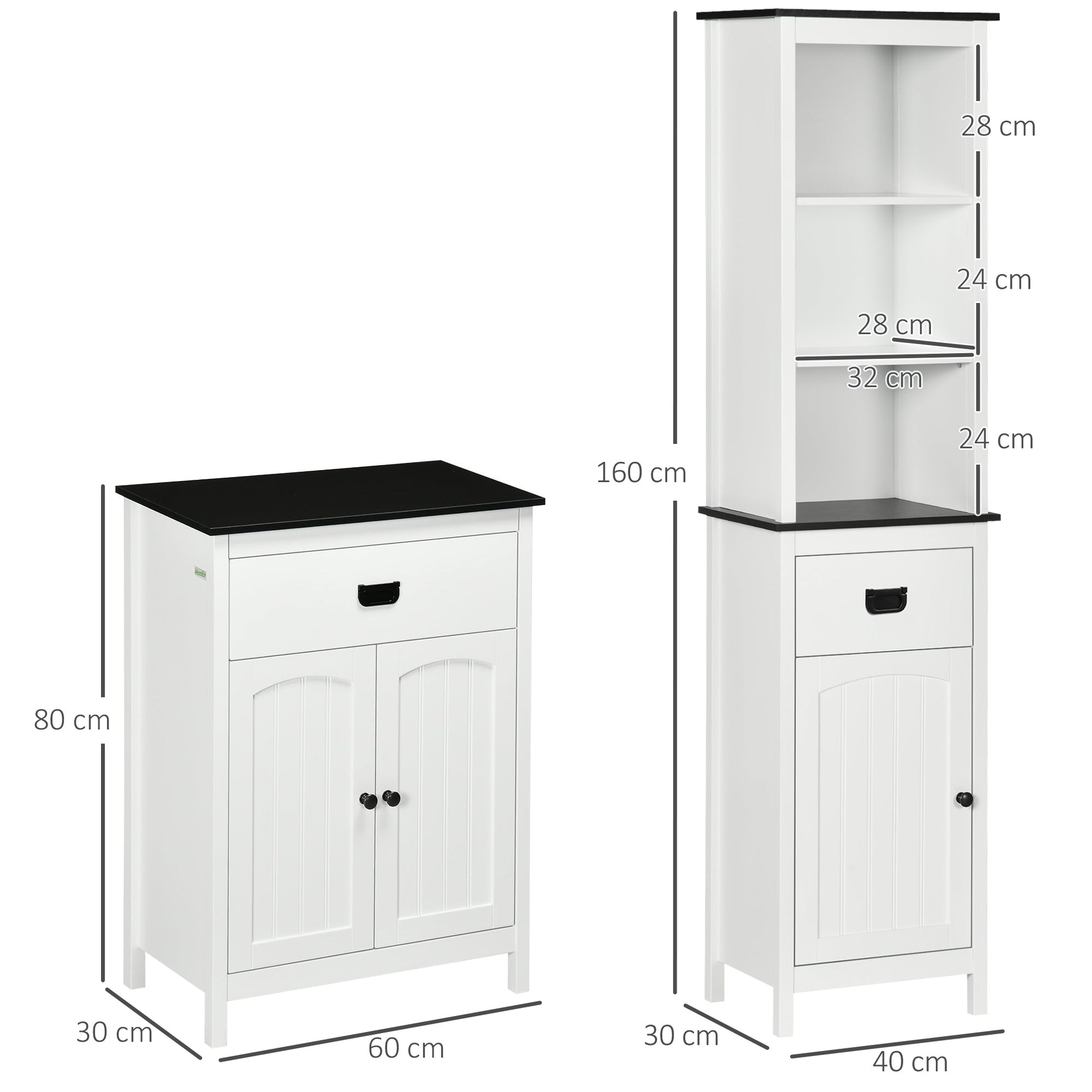 Revamp your restroom with the kleankin two-piece bathroom furniture set! This chic ensemble features a sleek white bathroom cabinet and a tall bathroom cabinet, both adorned with stylish black tops and handles. Enjoy lots of storage with easy-to-organise drawers and adjustable shelves, all wrapped up in a modern design that complements any bathroom decor. A brilliant blend of functionality and elegance!