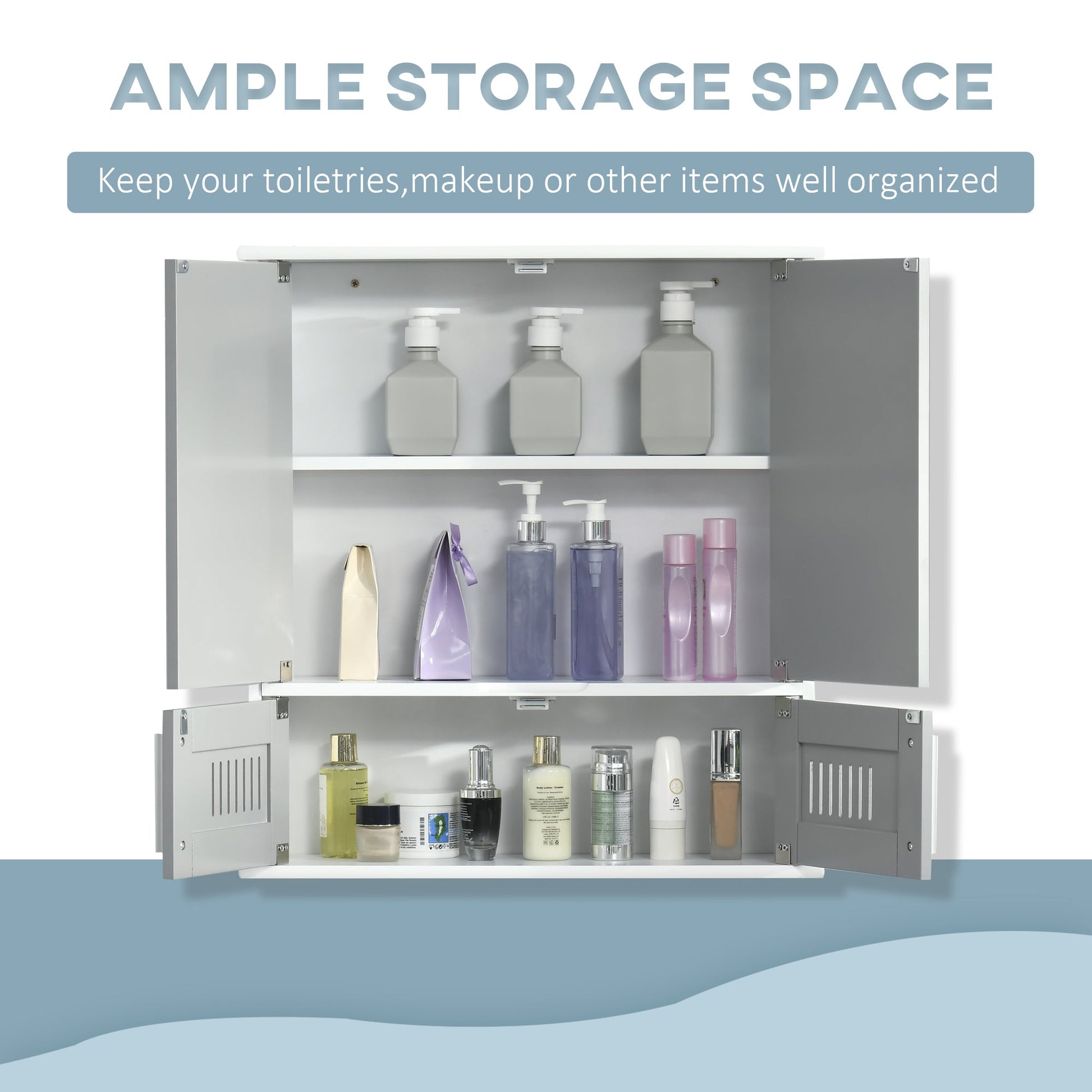 Creating stylish bathroom storage option has never been so easy - this kleankin medicine cabinet will do the trick instantly. Formed of a bottom shelf with small vented doors for airflow, with an two-compartment upper cabinet, there's plenty of space for keeping bottles, make-up, toiletries and everything in-between. Mirrored doors give you a place to see and get ready. The surface is painted for a smooth and easy-wipe finish. Setting it up is simple: simply fix on the wall securely and go.