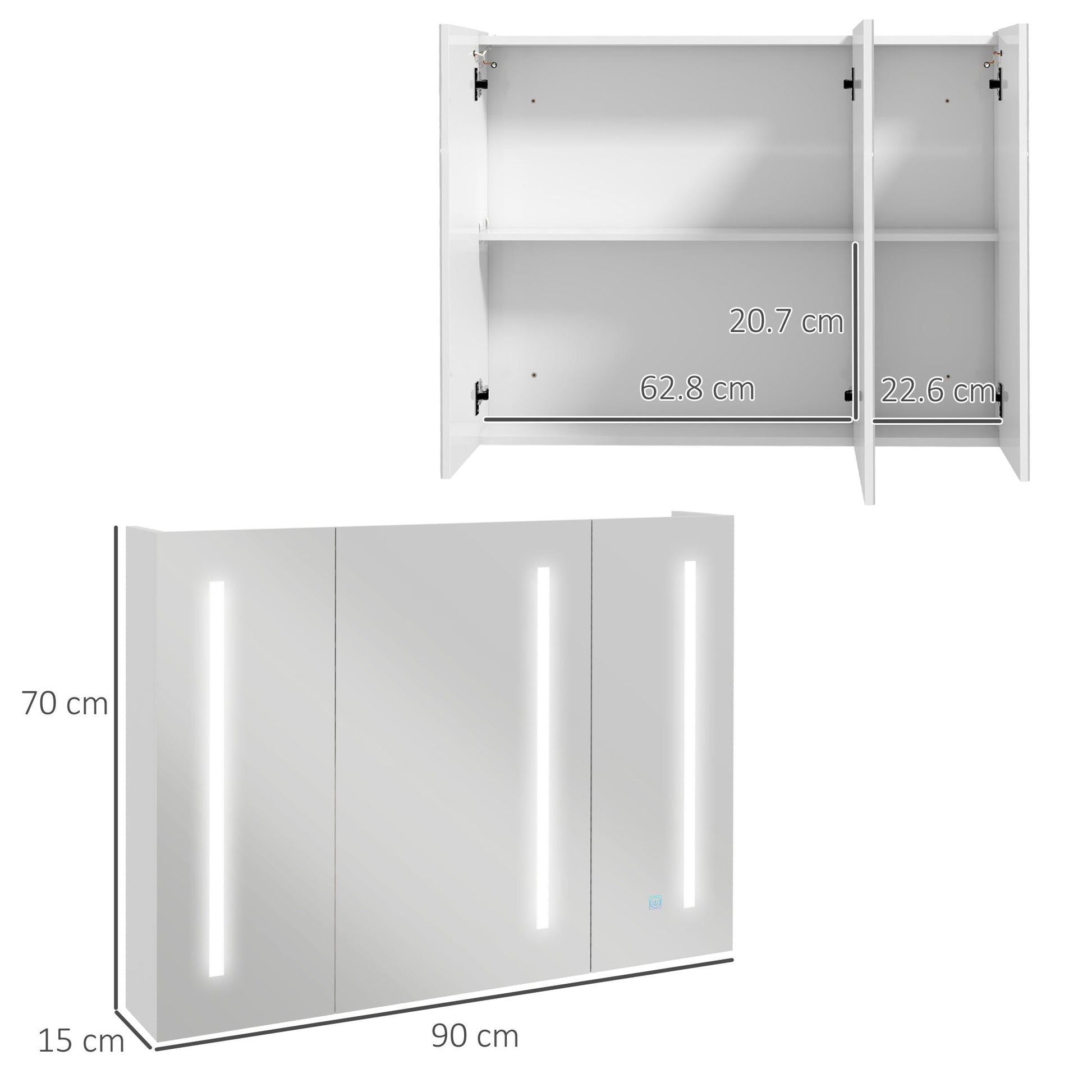 kleankin Bathroom Mirror Cabinet with Light, Bathroom Storage Cupboard with USB Charge, Adjustable Shelf, 90x15x70cm, White