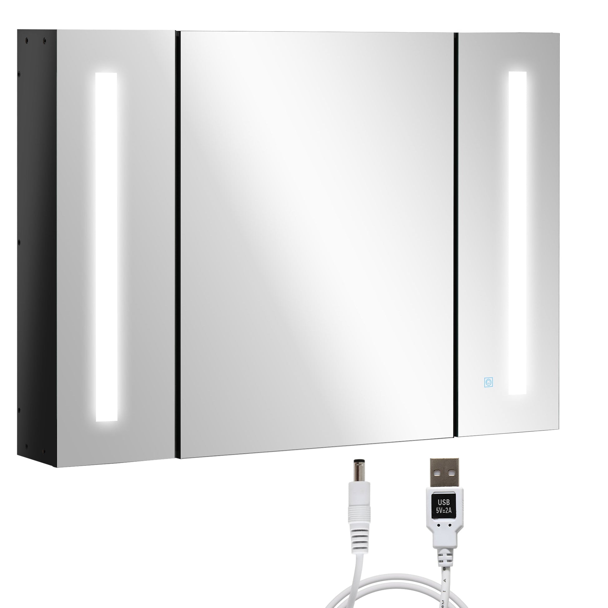 kleankin LED Bathroom Cabinet with Mirror, Wall Mounted Dimmable Brightness Storage Organiser with 3 Mirrored Doors and Adjustable Shelves, Memory Function, USB Charge, High Gloss Black
