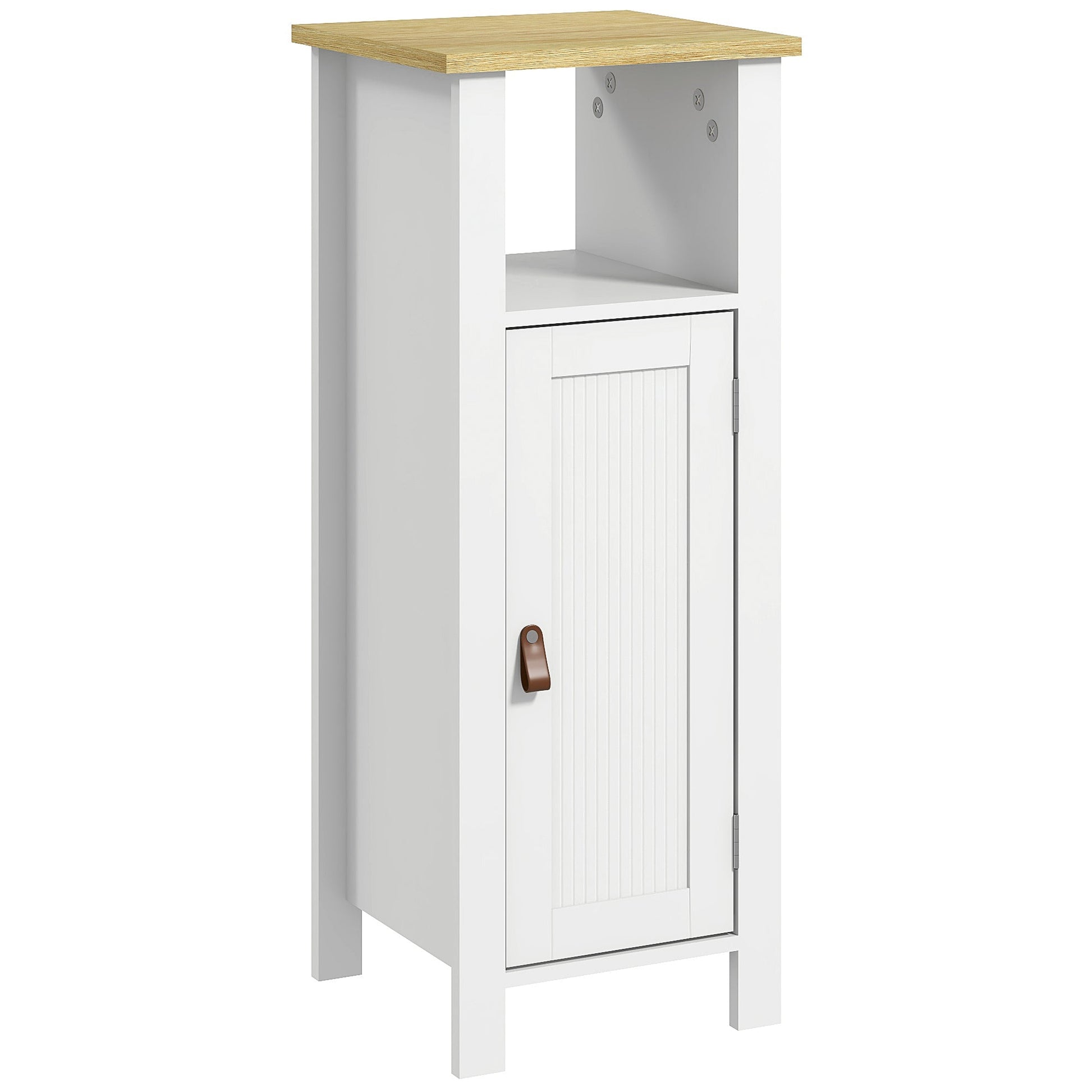 This kleankin bathroom floor cabinet unit provides extra space, wherever needed. It features a shelf, a two-tier cupboard and a flat top - plenty of room for towels, hygiene products and cleaning supplies, complete with a faux leather handle to open the door easily.