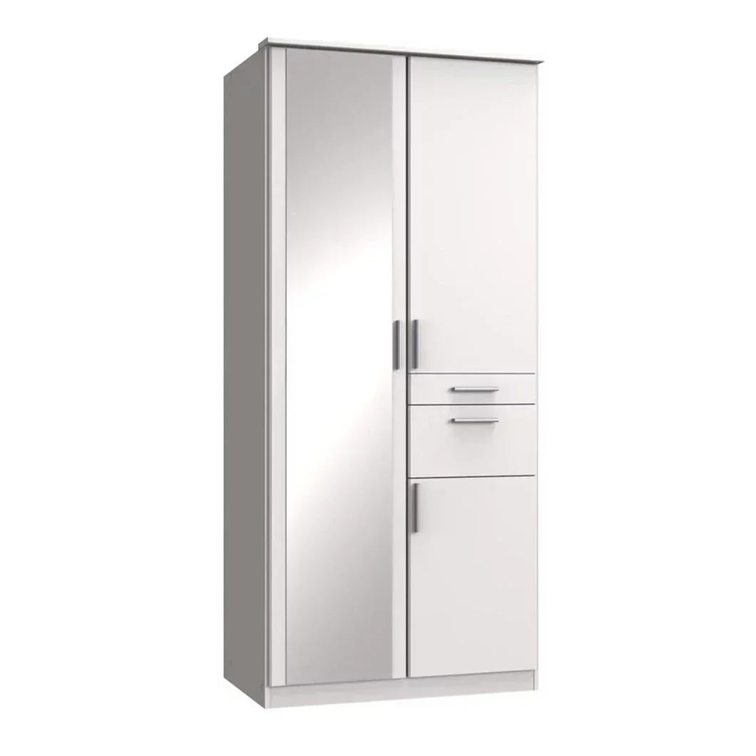 The Kodera 2 Door 2 Drawer Wardrobe offers a combination of hanging, shelving and drawer space. The wardrobe has trendy handles along with 1 door being mirrored which gives the wardrobe a modern look. This wardrobe gives you 3 different areas of storage. Right side section is divided with 2 drawers at the centre. This wardrobe has 3 small shelves and 2 small hanging rails.
