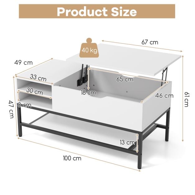Colour: Rustic Brown Material: Engineered Wood, Metal Product Size:100x 49x 47 cm (L x W x H) Overall Dimension(Lifting):100x 49x 61 cm (L x W x H) Dimensionof Hidden Space:65x 46x 18 cm (L x W x H) Dimensionof Side Platform:33x 49 cm (L x W) Dimensionof Open Shelf:30x 49x 8 cm (L x W x H) Length of Lifting Tabletop: 67 cm Height Between Shelf: 13 cm Clearance from Shelf to Ground: 9.5 cm Net Weight: 26 kg Weight Capacityof Tabletop: 40 kg Weight Capacityof Each Shelf: 20 kg Package Includes: 1 xLift Top Coffee Table 1 x Instruction Manual