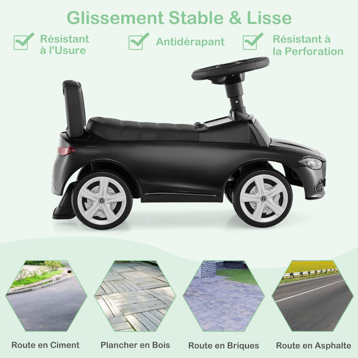 Introduce your little one to the joy of driving with this licensed Mercedes-Benz ride-on car! Designed to encourage active play, this car features a foot-controlled design that promotes balance and coordination. The steering wheel with realistic horn and engine sounds encourages imaginative adventures. Overall, the 4 large wheels with anti-tip protection ensure a safe, smooth glide on flat surfaces. The storage space under the seat offers some space so children can take their favorite toys with them during the ride. Perfect for toddlers ages 12 to 36 months, this sleek and stylish ride-on car makes any playtime a luxurious and exciting experience. Attributes: Foot-controlled movement: A ride-on toy is perfect for little ones, encouraging active play and improving balance and coordination. Little ones simply propel it with their feet, so it's great fun every time they whiz around! Interactive Sound Effect: Featuring a steering wheel with horn and authentic engine sounds, this vehicle adds wonderful acoustic excitement to every ride and inspires your child's imagination on their road trip adventures. Stable and smooth gliding: Built for safety and seamless fun, the car glides effortlessly on any flat surface. The sturdy wheels and anti-tip design ensure a stable ride, making it a safe choice for your child's first driving experience. Kid-Friendly Features: With under-seat storage for storing toys and snacks and easy steering, this kids car is designed for little drivers. It's perfect for improving motor skills while playing! Licensed by Mercedes-Benz: This sporty, elegant and officially licensed by Mercedes-Benz ride-on car transforms a luxury car into a child-friendly toy that will make your children look extra stylish while playing. Characteristics: Officially licensed by Mercedes-Benz Foot-controlled design with manual control for more fun steering wheel with horn and engine noises Provides a smooth and stable driving experience Robust wheels with anti-tip protection for high safety Practical storage space under the seat for a tidy play area Ideal for children aged 12 to 36 months Improves coordination and motor skills Suitable for indoor and outdoor use