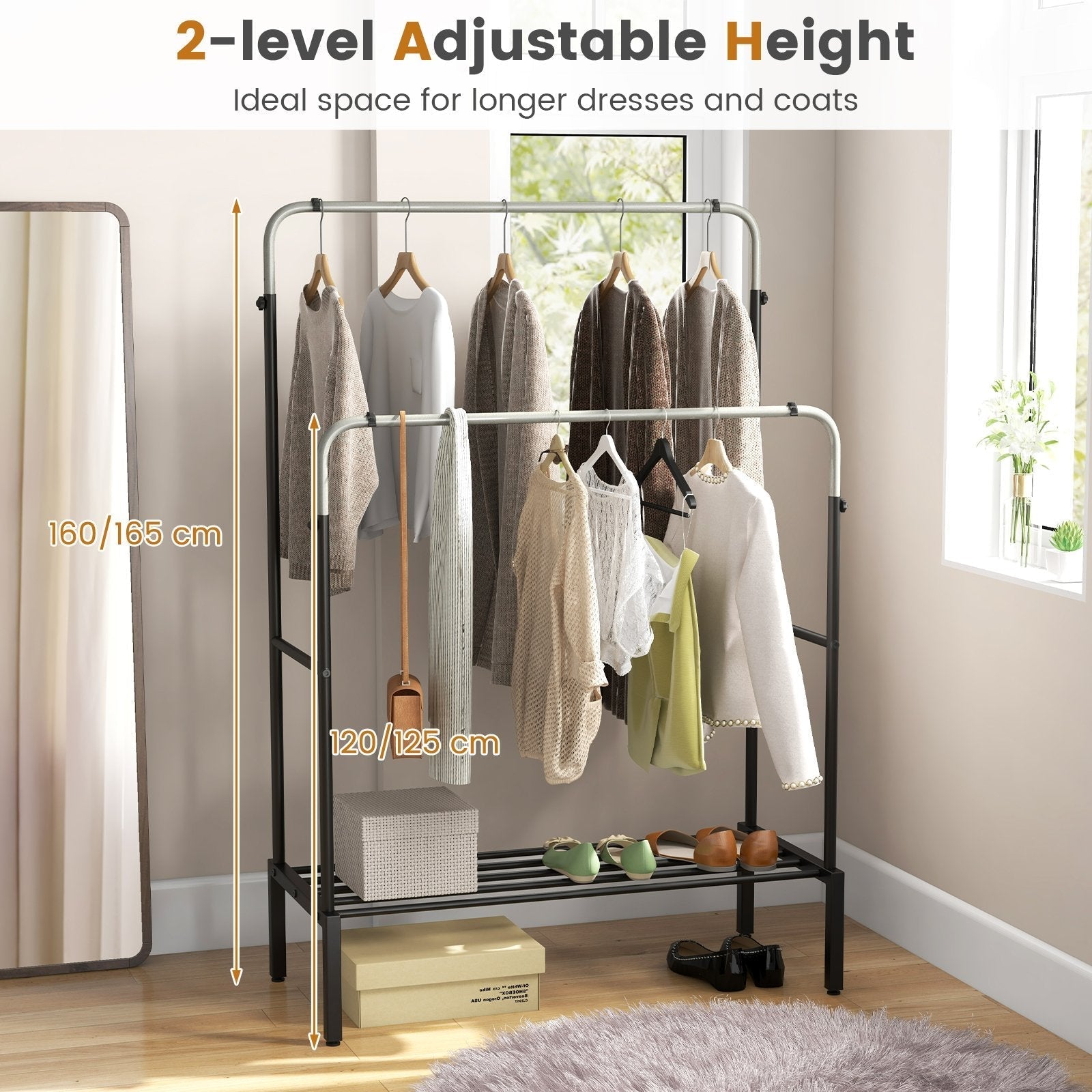 Metal Clothes Stand Rack with 2 Rods and Shoe Shelf-Silver