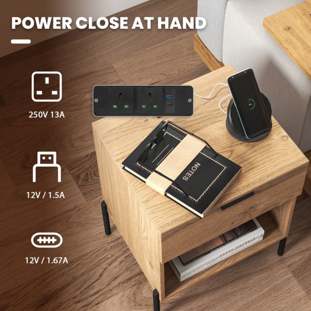 Colour: Natural Material: Engineered Wood, Metal, MDF Overall Dimensions: 48 x 40 x 58 cm (L x W x H) Interior Dimensions of Drawer: 36 x 28 x 8 cm (W x D x H) Dimensions of Open Compartment: 42 x 36 x 25 cm (W x D x H) Bottom Shelf from Ground: 15 cm AC Outlets: 250V 13A 50-60Hz USB Port: 12V / 1.5A Max. Type C Port: 12V / 1.67A Max. Weight Capacity of Top: 35 kg Weight Capacity of Drawer: 5 kg Weight Capacity of Bottom Shelf: 20 kg Package Includes: 1 x Nightstand 1 x Instruction Manual