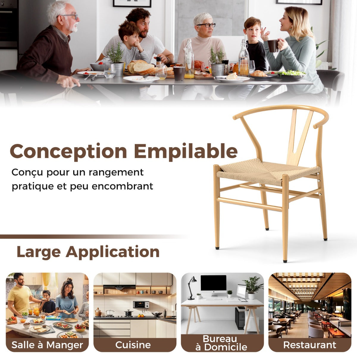 This wishbone dining chair set adopts Y-shaped integrated backrests and armrests that conform seamlessly to your body shape, ensuring optimal support and reducing back strain during long periods of sitting. Furthermore, the highlight of these chairs is the luxurious kraft paper twine woven seats, offering both comfort and sophistication. Constructed with heavy-duty metal frames and reinforced crossbars, complemented with adjustable footpads, these chairs provide a stable and reliable seating solution for daily use. When the meal is over, you can simply stack one chair on the top of the other, saving available floor space while making it easy to clean the floor. Inspired by mid-century modern aesthetics, featuring curved cutout backs and sleek tapered legs, these chairs are not only functional but also add a touch of elegance to your living space! Bullet Points:Ergonomic Design: These wishbone dining chairs adopt Y-shaped integrated backrests and armrests that conform to the natural curvature of your spine, offering superior comfort and support. The curved backrest design makes the chairs more comfy during long meals or work sessions. Unique Twine Woven Seat: The braided seat cushions are crafted with premium hand-woven kraft paper twine, providing a comfortable and breathable sitting experience. Moreover, this distinctive material also adds an element of luxury and texture to your dining area.Sturdy and Stable Construction: Supported by heavy-duty metal frames and reinforced with sturdy crossbars, these armchairs are built to last, ensuring a large loading capacity of 150 kg (each chair). Additionally, there are adjustable footpads for enhanced stability. Easy Storage and Assembly: These stackable chairs are designed with space-saving in mind, easily stacking when not in use to free up space. Setting up these chairs is also a breeze, thanks to the simple structures by only connecting the backrests, seats, and legs. Mid-Century Modern Appeal: With the combination of curved cutout backs, twine woven seats, and cylindrical tapered legs, these mid-century modern accent chairs could create a striking centerpiece in any style room. Wide Application: Each set includes 2 chairs, the chair measures 46 x 59 x 73 cm (L x W x H), the seat measures 46 x 40 cm (L x W), and the seat height is 44 cm. The chair set is perfect for various occasions, from dining areas to offices or even as stylish accent pieces in your living room.