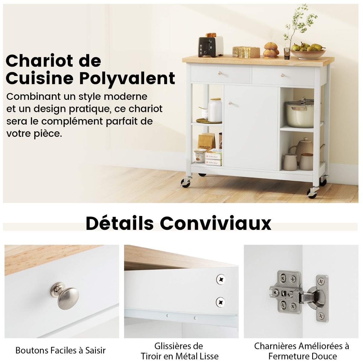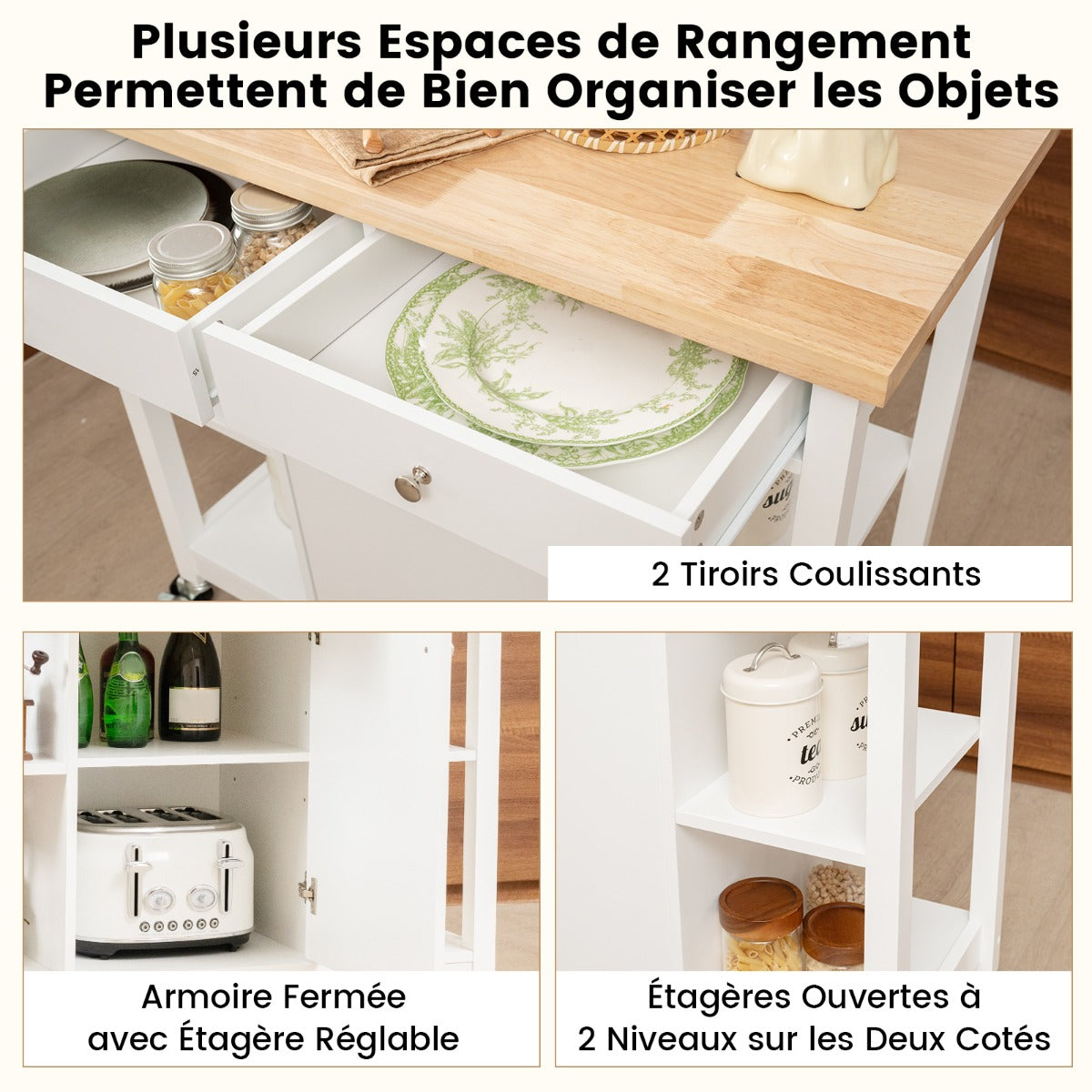 Mobile Kitchen Island Cart Rolling Kitchen Island with Rubber Wood Top-White