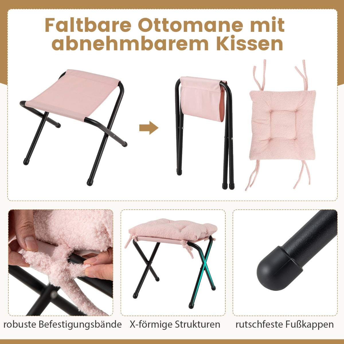 -Soft head pillow filled with PP cotton for optimal comfort-Ergonomic backrest and armrests offer ultimate relaxation-Rustproof metal tube base provides robustness and stability-Multi-use ottoman quickly serves as a coffee table, extra seat, or footrest-Sherpa cover for an elegant flair and a comfortable touch-Anti-slip foot pads to protect your floor from scratches-Convenient side pocket for easy storage and keeping items handy-Buckle, straps, and hook and loop fasteners for firm connections-Stylish button tufting brings a timeless elegance to any space-Suitable for living rooms, bedrooms, dorms, offices, porches, and more