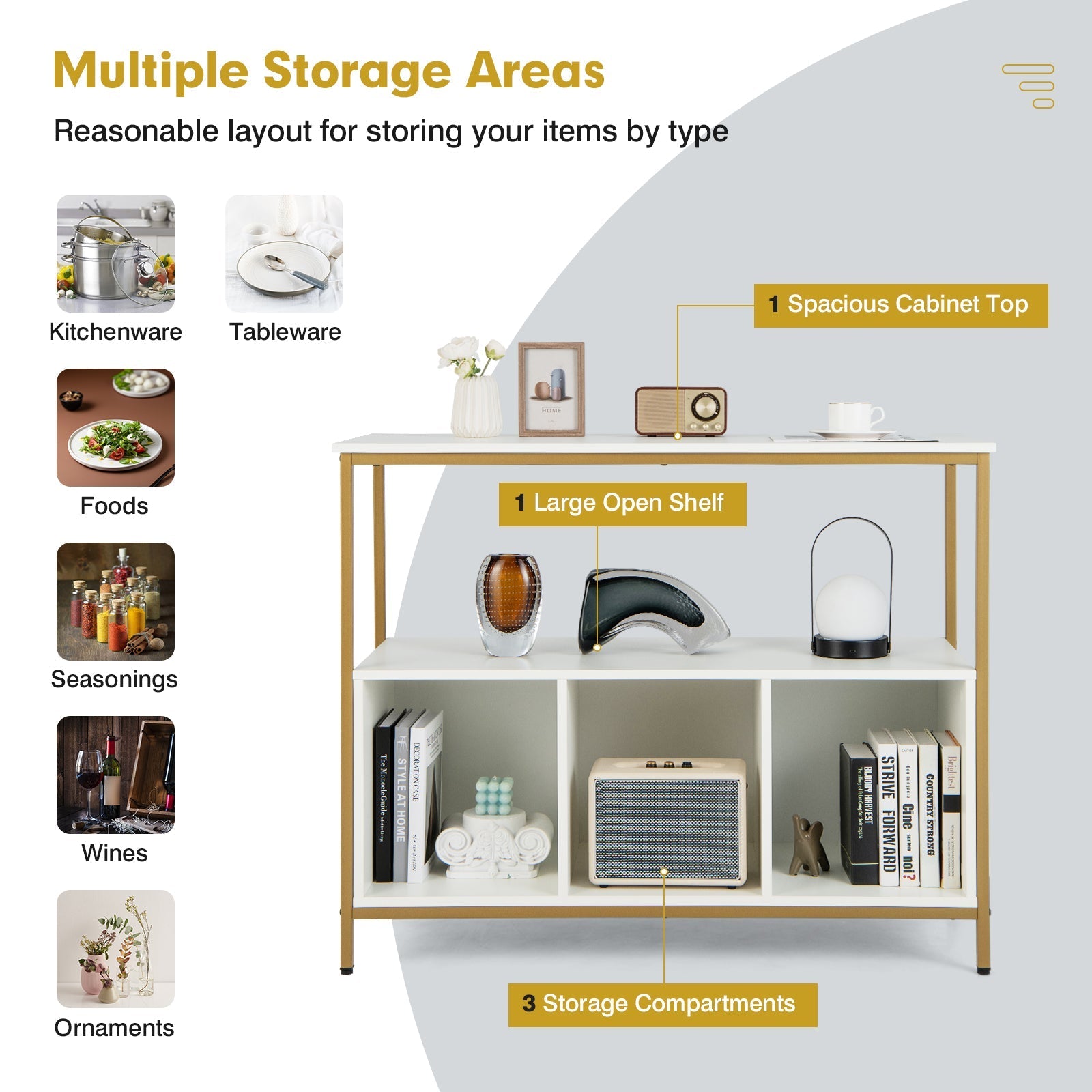 This stylish buffet sideboard is a multi-functional storage cabinet to help store, organize, and display items. This pantry cupboard features a spacious countertop, a fully open shelf, and 3 spacious compartments, providing plenty of storage space to put anything you like for your living room, kitchen, dining room, and office. There are many worth mentioning details to explore. Made of sturdy steel construction, the wood sideboard is durable, rustproof, and deform-resistant for long-time uses. Its minimalist and modern design can match well with various home decorations. This kitchen sideboard is multipurpose and practical for various ways and rooms. It can act as a storage cabinet in the bedroom, a buffet or sideboard in the kitchen, and a console table in the entryway. Ample Storage Space: The buffet sideboard is designed with a spacious countertop, large middle shelf, and 3 adequate storage compartments to keep your item well organized. Featuring fully open design for easy access, it can be used to hold kitchen appliances, tableware, pots, bowls, vegetable, fruit, wine, drinks, flower vase or other essentials to maximize your home space. Premium and Reliable Material: Made of extra thick material, the sideboard with exquisite craftsmanship is waterproof and anti-scratch for a long lifespan. Moreover, the power-coated steel frame enhances stability of this storage cabinet. The cabinet top and open compartment can withstand a large capacity without being bent or deformed. Superior and User-friendly Details: The steel frame boasts rustproof welding technology and reinforced design, providing enhanced support for higher safety. The adjustable foot pads highly improve overall stability. The clearance from ground is 9 cm, which makes it possible to let a sweeping robot pass, so as to simplify your cleaning work. Stylish Outlook and Versatile Usage: The kitchen buffet featuring an elegant finish of a simple and modern style adds a sense of elegance to match any of the home styles. Can be used as a storage cabinet or a display shelf in the living room, or a cupboard in the kitchen. It is a functional storage cabinet, perfect for your kitchen, bedroom, entryway, hallway, etc. Easy to Assemble and Maintain: Detailed instructions and all hardware are included for you to finish the assembly quickly and easily. The veneer boards and powder-coated pipes have easy-to-clean surface and are not easy to get dirty after long-time use. Stains left on the buffet sideboard can be wiped easily for daily maintenance.