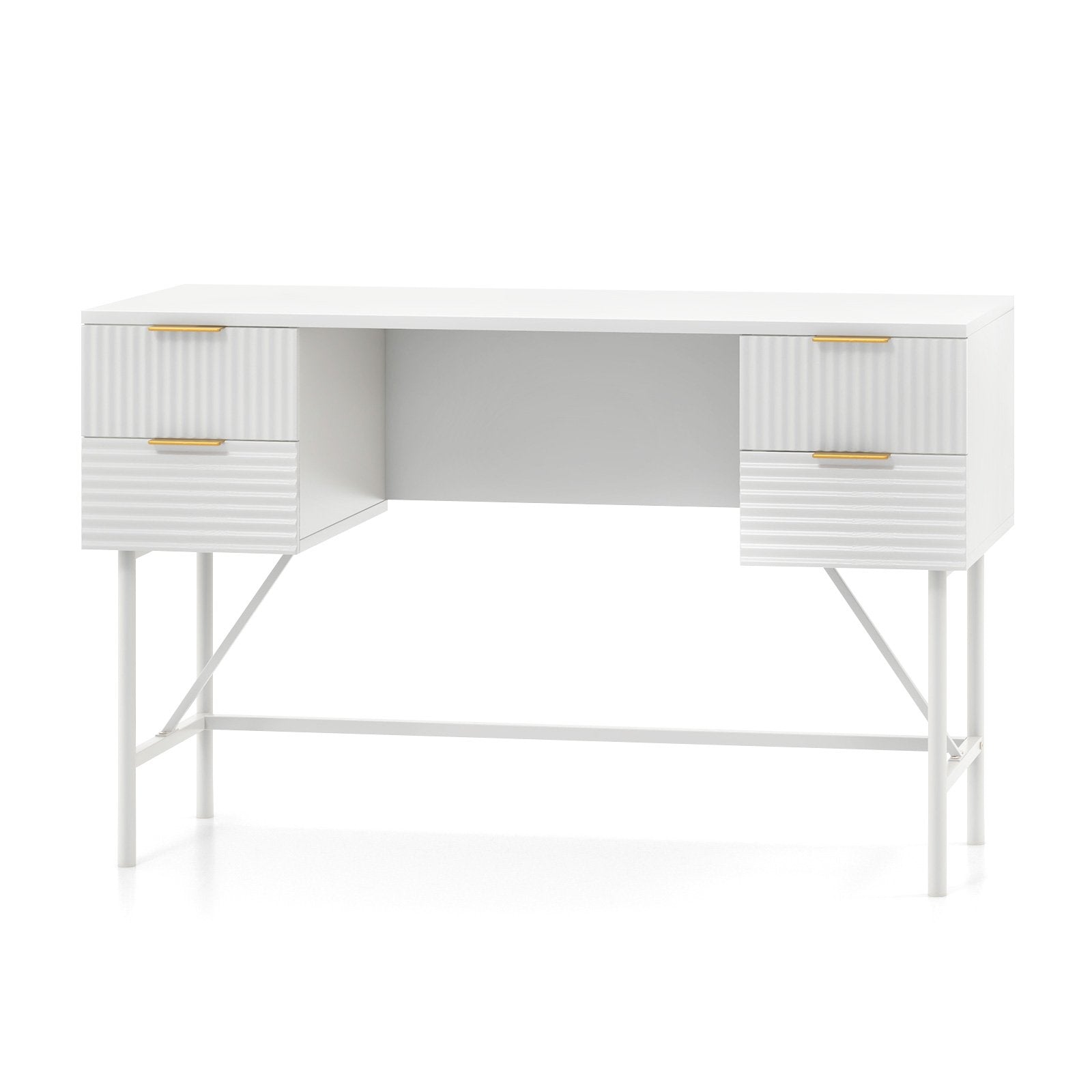 Spacious desktop provides optimal workspace for you and keeps office essentials within reach. In addition, there are 4 drawers to enlarge storage capacity and classification space for a variety of items, so as to free up more tabletop space. Crafted of thickened board and heavy-duty metal frame, the study desk is sturdy and reliable for long-term use. All in all, the modern computer desk is a piece of versatile furniture that goes well with various furnishing styles. Large Work Surface: With the tabletop size of 120 x 48cm(L x W), the computer desk is large enough to hold office supplies and offers enough working space for home office activities. The high-legged design allows your chair to fit well under the table so you can stretch comfortably. Ample Storage Space: Except for the large desktop, the home office desk features 4 drawers to suit storage needs. In this way, you can store all sorts of files and other essentials inside to secure them, which is easily accessible as well. Durable and Rugged Construction: The combination of powder-coated metal frame and thickened tabletop, not only provides superior stability and durability, but also ensures longer service life. The computer workstation boasts total weight capacity of 111kg. Multipurpose Working Spot: The pure white looking and drawers with rippled design endow understated elegance to the workstation, making it a good addition to home and office. Except as a writing desk, it can serve as a computer desk, study desk, makeup table. User-friendly Accessories and Easy Assembly: Smooth slide rails and metal handles equipped there make it convenient to either open or close the drawers. By the way, all necessary hardware and parts are labeled to help you simplify assembly steps.