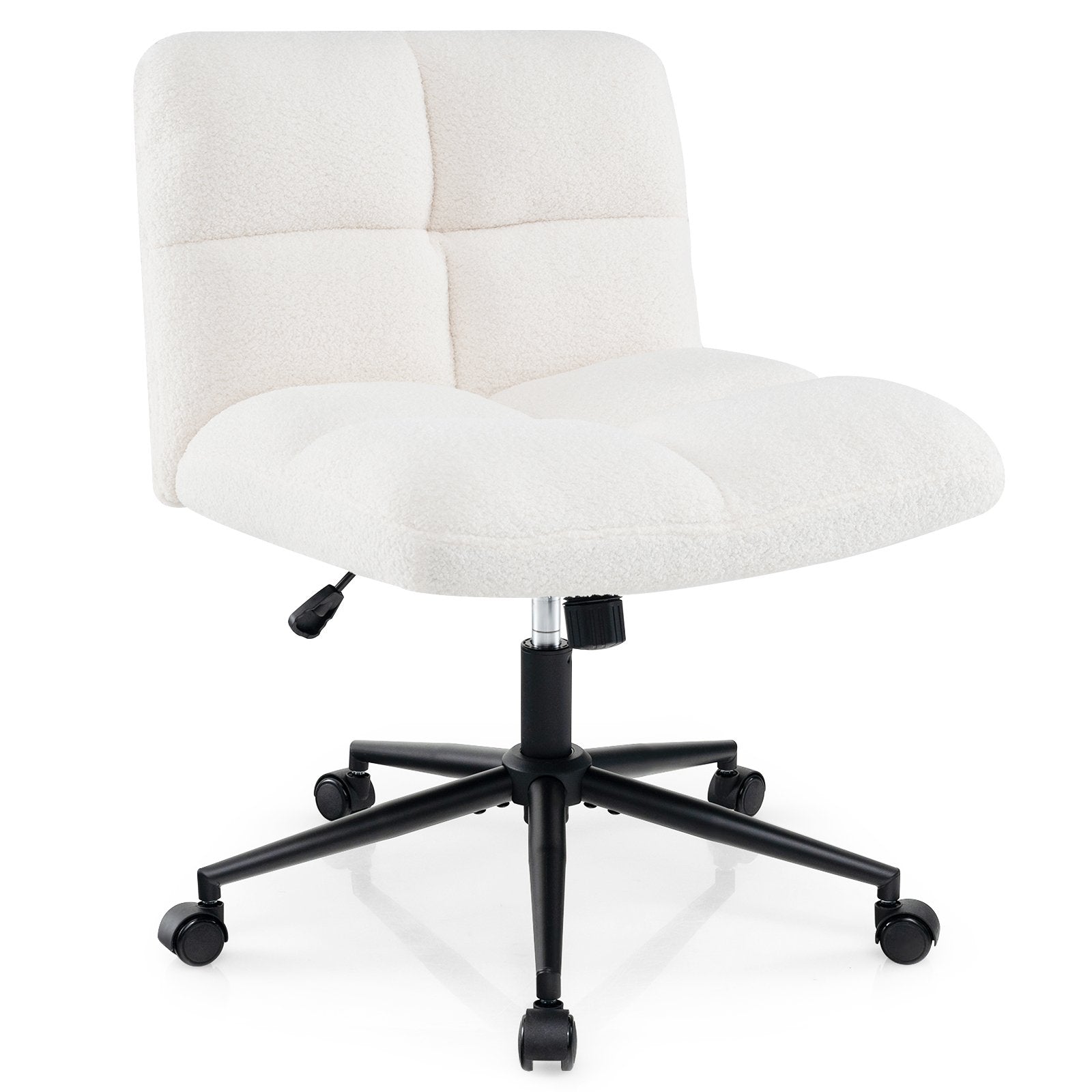 Upgrade your workspace with the cross-legged chair with wheels. This upholstered home office chair combines comfort and style, featuring a padded wide seat for cross-legged sitting. Upholstered with skin-friendly imitation lamb fleece, the office desk chair offers a plush and cozy seating experience. Experience customized seating with multiple adjustments, including an adjustable height design and a rocking function with an adjustable angle for added relaxation. The swivel feature adds convenience and flexibility to your workspace setup. The 360° rolling wheels allow for effortless movement, while the stable 5-claw metal base ensures stability and security. This modern swivel desk chair is perfect for various settings, including home offices, bedrooms, and studies. Comfortable Cross-legged Chair: The armless seat with a wide U-shaped cushion provides ample space for cross-legged sitting, ensuring comfort during long hours of use. Its ergonomic backrest provides excellent lumbar support, reducing back strain. This cross-legged chair is perfect for those who like to sit cross-legged while working or studying. Exceptional Sitting Comfort: The seat and backrest are filled with ultra soft polyfiber and high density sponge, providing ultimate comfort and support for long hours of sitting. Upholstered with skin-friendly imitation lamb fleece, this office desk chair offers a soft, comfortable surface for a cozy seating experience. Multiple Adjustments for Customized Seating: This computer desk chair features an adjustable height design with a range from 49-58 cm, ensuring you can find the perfect seating position. The rocking function (adjustable angle: 100°-120°) allows you to enjoy the gentle rocking motion for added relaxation during work or study. Smooth Mobility and Stability: Equipped with smooth universal wheels, this cross-legged vanity chair offers easy mobility across various surfaces. With its stable 5-claw metal base, this chair offers enhanced stability and security, providing peace of mind even when moving or shifting positions. It can support weight up to 160 kg. Modern and Versatile Design: The sleek, modern design of this swivel task chair enhances the aesthetic appeal of any room. It is perfect for any space, whether it's your living room, office, bedroom, or study. When not in use, this armless desk chair can be pushed under the desk to save floor space.