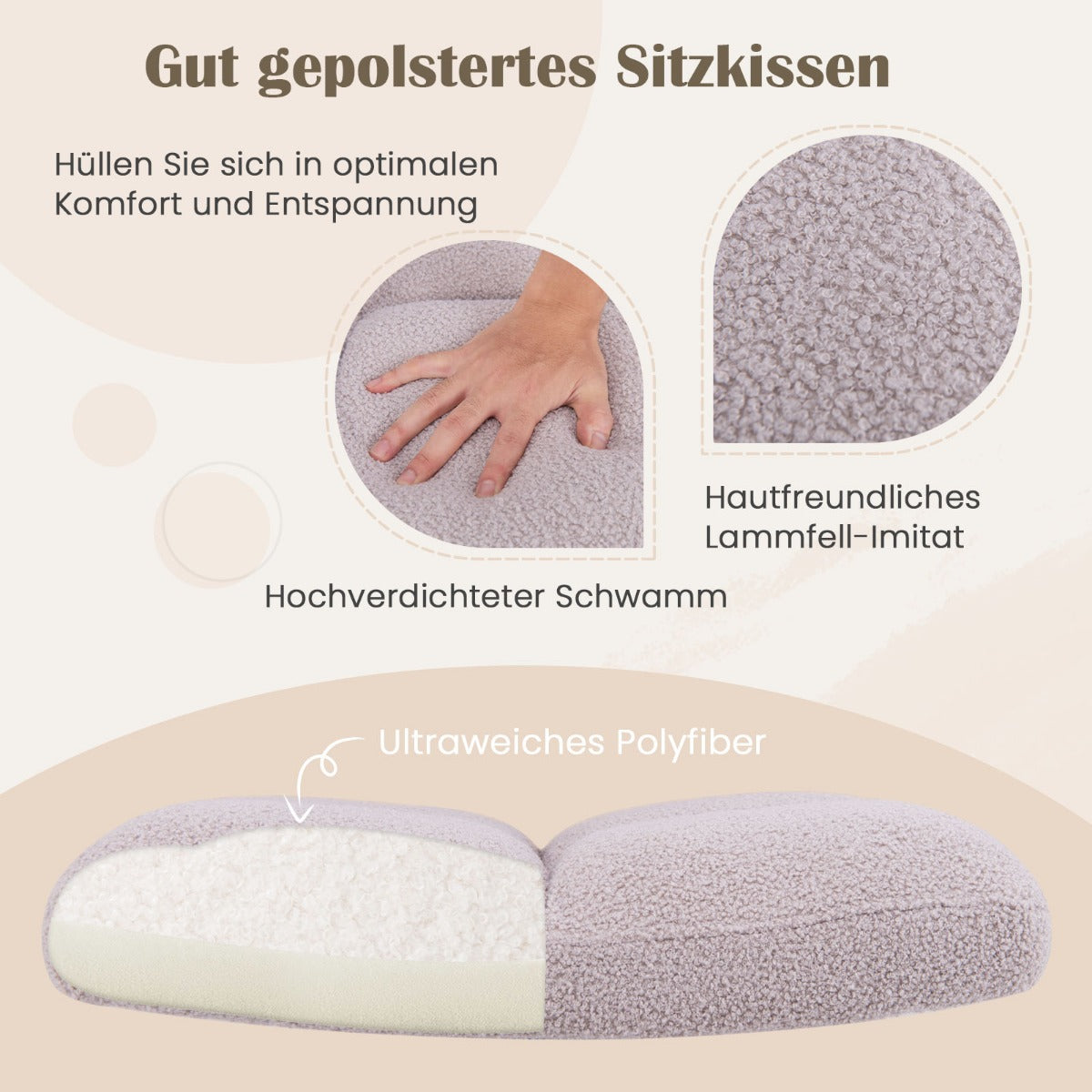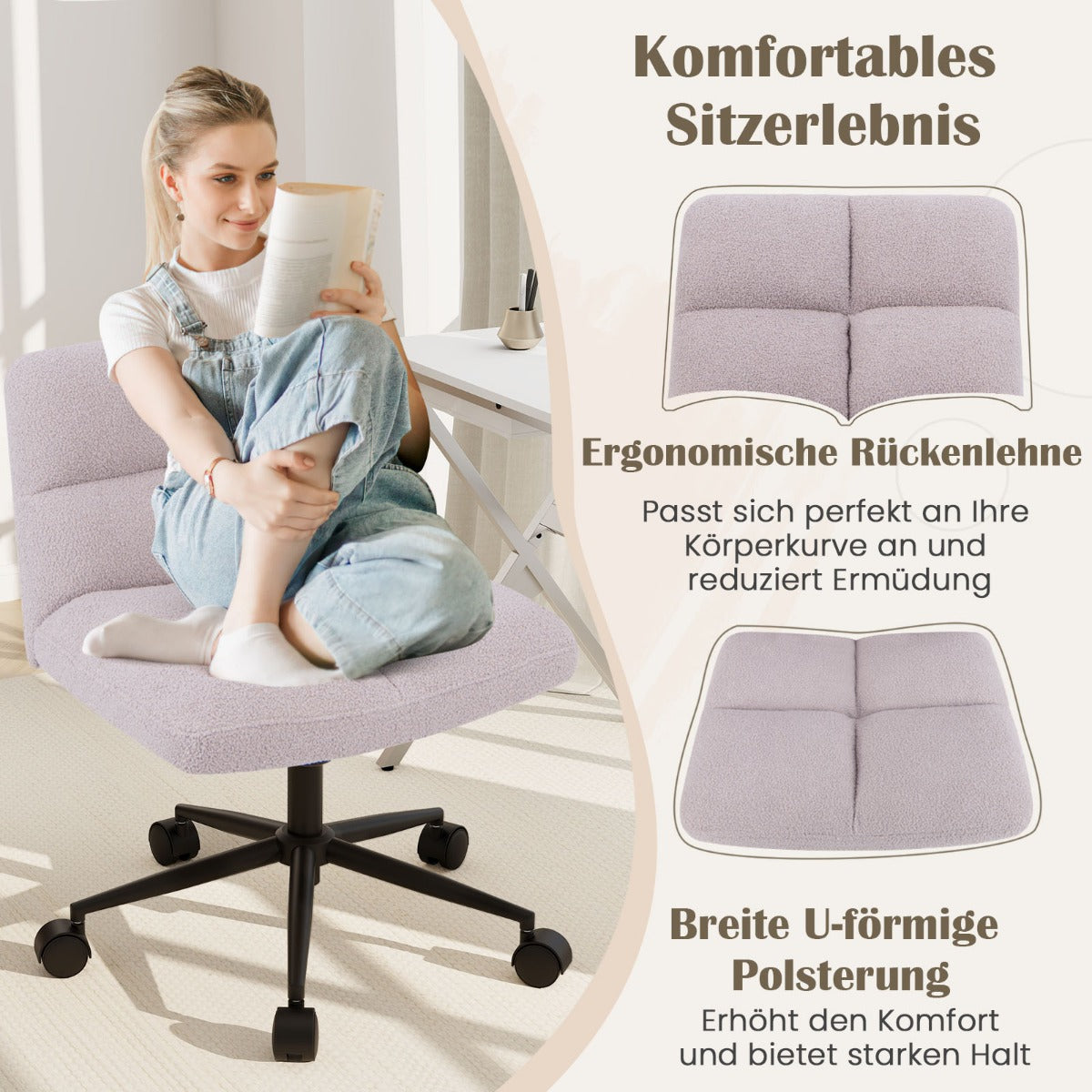 Upgrade your workspace with the cross-legged chair with wheels. This upholstered home office chair combines comfort and style, featuring a padded wide seat for cross-legged sitting. Upholstered with skin-friendly imitation lamb fleece, the office desk chair offers a plush and cozy seating experience. Experience customized seating with multiple adjustments, including an adjustable height design and a rocking function with an adjustable angle for added relaxation. The swivel feature adds convenience and flexibility to your workspace setup. The 360° rolling wheels allow for effortless movement, while the stable 5-claw metal base ensures stability and security. This modern swivel desk chair is perfect for various settings, including home offices, bedrooms, and studies. Comfortable Cross-legged Chair: The armless seat with a wide U-shaped cushionprovides ample space for cross-legged sitting, ensuring comfort during long hours of use. Its ergonomic backrest provides excellent lumbar support, reducing back strain. This cross-legged chair is perfect for those who like to sit cross-legged while working or studying. Exceptional Sitting Comfort: The seat and backrest are filled with ultrasoft polyfiber and highdensity sponge, providing ultimate comfort and support for long hours of sitting. Upholstered with skin-friendly imitation lamb fleece, this office desk chair offers a soft, comfortable surface for a cozy seating experience. Multiple Adjustments for Customized Seating:This computer desk chair features an adjustable height design with a range from 49-58 cm, ensuring you can find the perfect seating position. The rocking function(adjustable angle: 100°-120°)allows you to enjoy the gentle rocking motion for added relaxation during work or study. Smooth Mobility and Stability: Equipped withsmooth universal wheels,this cross-legged vanity chair offers easymobility across various surfaces.With itsstable 5-claw metal base,this chair offers enhanced stability and security, providing peace of mind even when moving or shifting positions. It can support weight up to 160 kg. Modern and Versatile Design:The sleek, modern design of this swivel task chair enhances the aesthetic appeal of any room. It is perfect for any space, whether it's yourliving room, office, bedroom, or study. When not in use, thisarmless desk chair can be pushed under the desk to save floor space.
