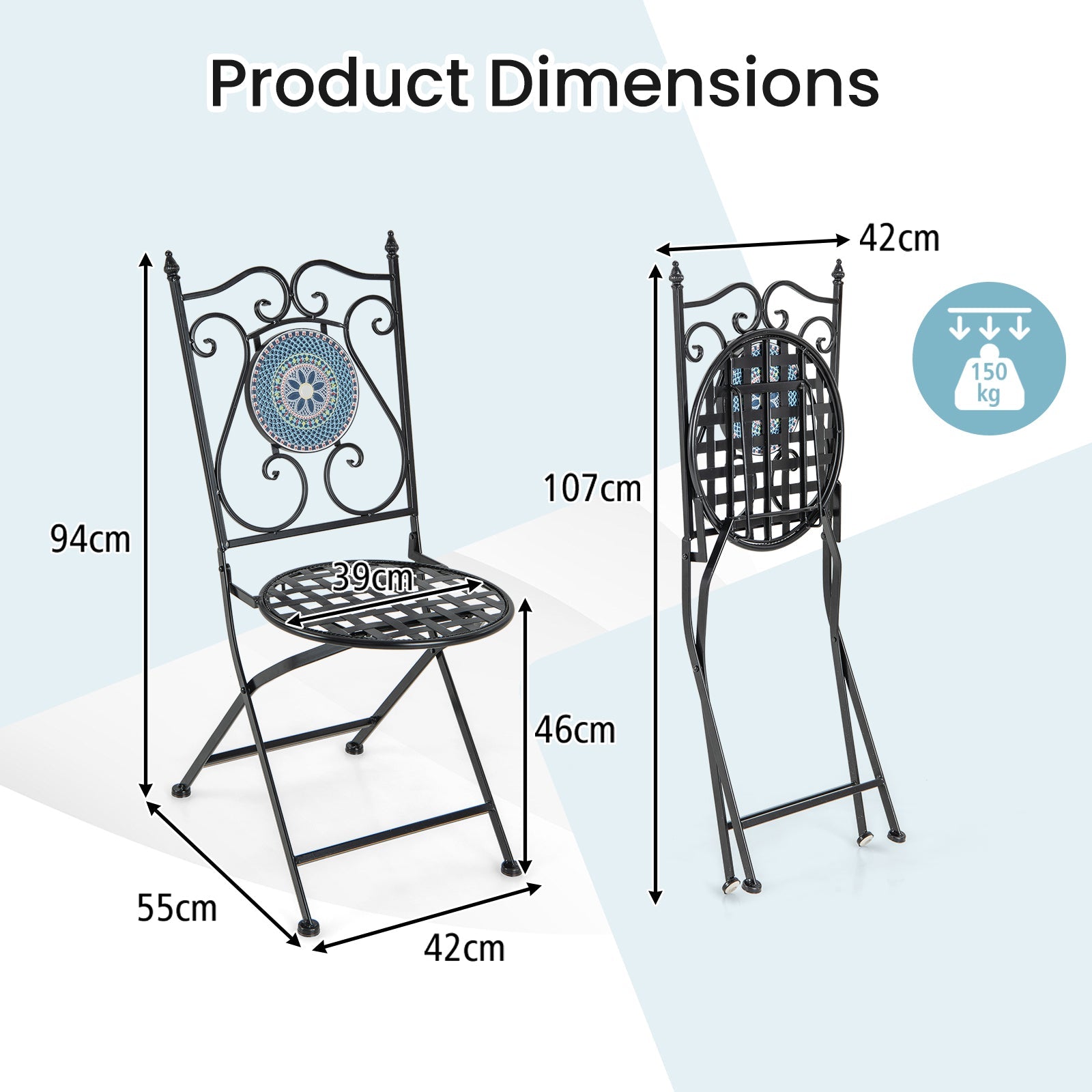 Colour: As Picture Shows Material: Metal, Tile, Concrete Dimension of Each Chair: 55 x 42 x 94 cm (L x W x H) Folding Dimension of Chair: 107 x 42 cm (L x W) Seat Height: 46 cm Weight Capacity: 150 kg Total Net Weight:12 kg Package Includes: 2 x Folding Chairs 1 x Instruction Manual Box QTY: 1(May vary by batch)