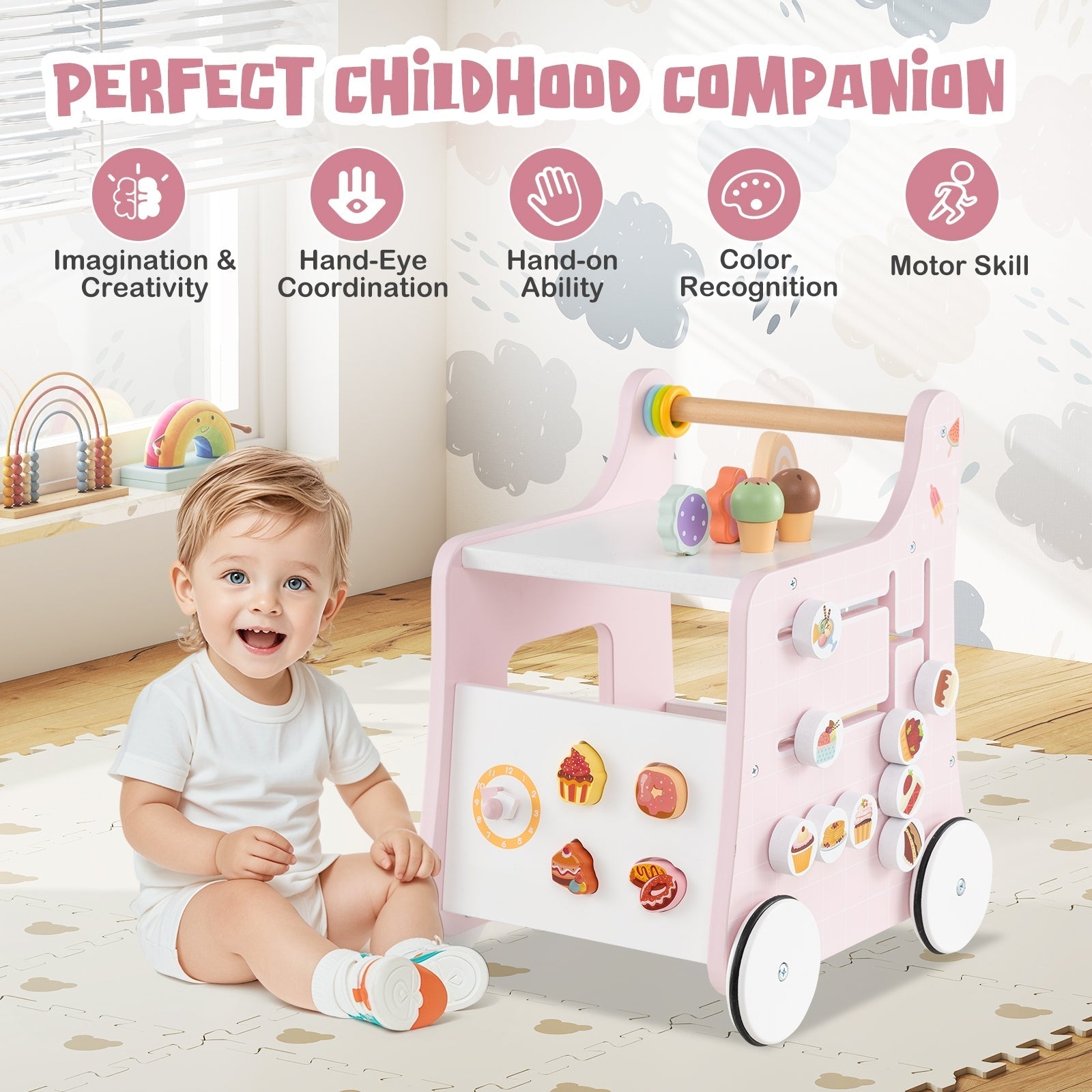 This Montessori walking toy offers a multitude of play possibilities for children, from being a push walker to a kiosk, food maze, clock, storage compartment, ice cream holders, shape sorters, and colorful rings. Not only can kids enjoy the fun of role-playing, but they can also learn to walk properly. Designed with comfort in mind, the ice cream walker features an easy-to-grasp handle and smooth wheels for easy pushing or pull. Complete with 14 imaginative accessories, this learning activity walker encourages immersive pretend play. It is EN71compliant, making a delightful present for children to enhance their early childhood development. Bullet Points: 8-in-1 Multifunctional Design:Apart from a push walker, this pretend play toy consists of a kiosk, food maze, clock, storage compartment, ice cream holders, shape sorters and colorful rings. These interactive areas enrich children’s playtime, inviting them to enjoy hours of entertainment. Ergonomic andComfy for Kids:The wooden baby walker features an easy-to-grip handle and smooth wheels, encouraging children to walk in a healthy posture for the formation of normal legs rather than bow legs. The wheels are equipped with rubber rings for skid resistance and quiet movement. Pretend Play with Accessories: Designed for imaginative role-play, this ice cream walking toy comes with 14 delightful accessories, including ice creams, ice pops, cakes, bread, a milk bottle, plate and spoon. Kids can engage in interactive play as shopkeepers and customers. Child-Friendly Construction:Safety is paramount in the Montessori walker toy, crafted with a splinter-free surface and rounded edges to protect tender hands during play. Additionally, this learning activity walker complies with ASTM and CPSIA, adding to the overall reliability. Fun andEducational Gift Option:This push and pull baby walker is more than just a toy; it is a comprehensive developmental learning tool to aid in your child’s early education. Ideal for kids above 1 year old, the ice cream walker promotesmotor skills, hands-on ability, logical thinking and color recognitionin a joyful manner.