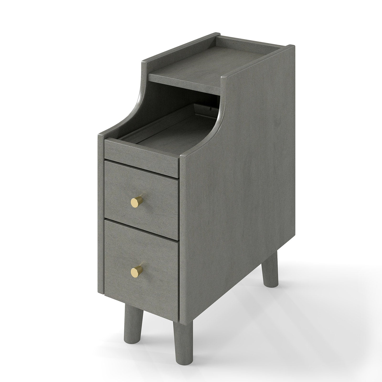 Narrow Nightstand Solid Wood End Table with Pull-out Tray 2 Storage Drawers-Grey