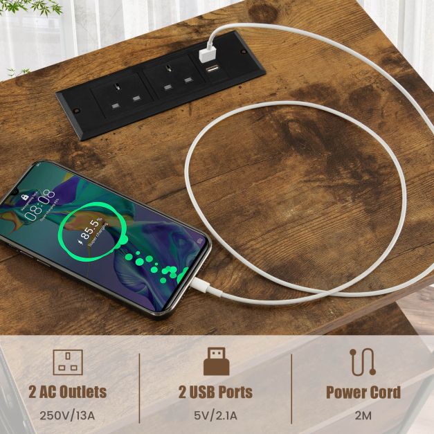 Designed with your needs in mind, this sleek and modern end table features a 4-port charging station to charge all your devices. And that's not all! This nightstand is also a storage powerhouse, with a spacious tabletop, an open shelf, 2 spacious drawers, and 6 side storage pockets. Finally, you can keep all your essentials neatly organized and within arm's reach. Crafted with attention to detail, our nightstand boasts a rustic elegance. Its warm wood grain goes well with the matte black frame, adding a touch of sophistication to any decoration. Plus, it's built to last with sturdy metal frame, fitted with adjustable foot pads for added stability. If you are looking for such a product, do not hesitate to buy it! Charging Has Never Been Easier: The nightstand is designed with a built-in charging station, complete with 2 socket outlets and 2 USB ports. Now, you can conveniently charge your devices right by your bedside, ensuring that you never wake up to a dead battery again! Goodbye to Clutter: A wise storage solution to small spaces! With an open shelf and 2 storage drawers, this end table offers ample storage space for all your bedside essentials. The 6 side storage pockets in 3 sizes keep tablets, remote controls and other small items well organized. An Industrial Masterpiece: Add a touch of rustic elegance to your bedroom with this sleek and stylish bedside table. Its warm color and wood grain finish will effortlessly complement any decorations, enhancing the overall aesthetic of your space. Built to Endure Test of Time: Crafted from powder-coated metal tubes and thick engineered wood panels, this nightstand is built to last. There are 4 adjustable foot pads to further ensure stability, while its durable finish guarantees easy cleaning and long-lasting use. Assembly Made a Breeze: We've made assembly as simple as possible. With detailed instructions, this side table can be set up in just a few easy steps. The folding fabric drawers are also a breeze to assemble, allowing you to enjoy the convenience of our nightstand in no time.