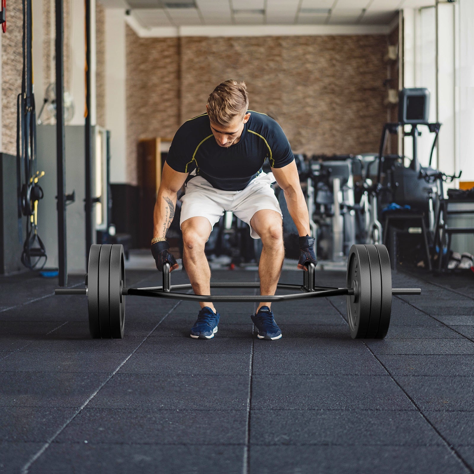 Crafted from high-quality steel with galvanized surface, this hex trap bar is not only durable but also solid. Plus, the deadlift bar is equipped with anti-slip 1.2 mm knurled handles, ensuring a firm and secure hold during workouts. And the flat or raised handles will give you more flexibility. The 2.5 cm diameter loadable steel sleeves with a length of 26 cm accommodate 2.5 cm standard weight plates. 2 spring collars ensure that your weight plates stay securely in place during your intense workouts. Besides, the Olympic hex trap bar boasts an impressive maximum weight capacity of 500 lbs, making it suitable for users of all fitness levels. Extended Loadable Sleeve: This 142 cm long hex bar is built with 2 solid steel sleeves with a loadable length of 26 cm each. And it is suitable for 2.5 cm weight plates and can support a weight capacity of 230 kg. Besides, 2 spring collars are provided to secure weight plates in place. Foldable Handle Design: The Olympic trap bar features 2 folding handles, which offer 2 deadlift positions for you to choose: high deadlift/low deadlift. In addition, textured with 1.2 mm diamond knurling, the handles are non-slip and comfortable to grip. Built to Last: Constructed of solid and rustproof galvanized steel pipes, this Olympic hex bar is designed for heavy weight lifting workouts and long lasting use. Moreover, with the firm and seamless welding process, the hex bar ensures superior deformation resistance and sturdiness. Versatile Workout: With this multifunctional hex bar, you can perform multiple exercises and build your full body strength from the comfort of your home, like deep squat, deadlift, bench press, floor press, etc. Plus, you can fold down the handles to store the trap bar under the bed or sofa easily after training. Unique Hex Shape: The weight lifting bar with a hexagonal shape helps keep weight centered through the body's mid-line during deadlifts and reduce back stress. In addition, 15 cm enough space between the weight plate and handle ensure the safety of your hands during the workout.
