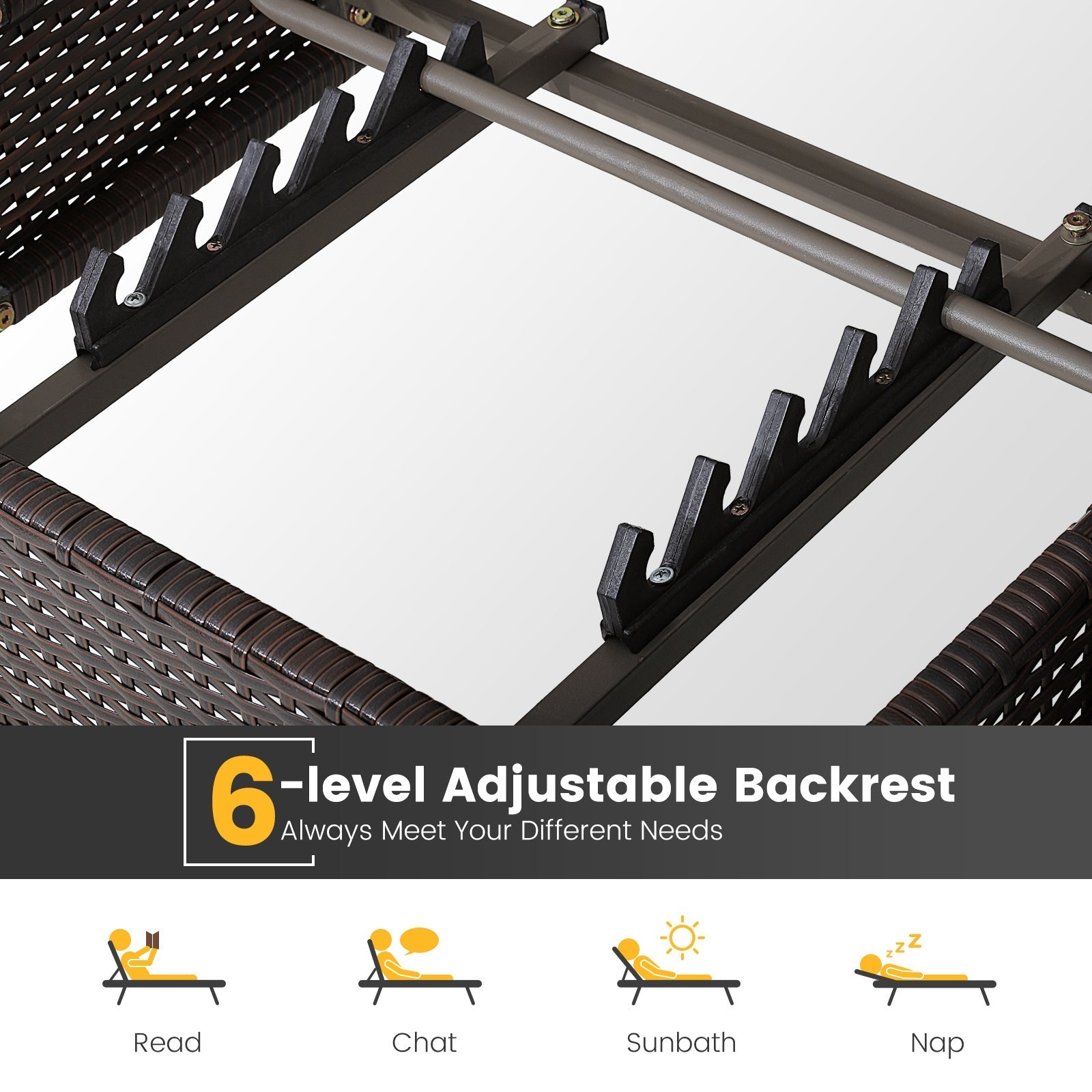 Compared with normal outdoor reclining chairs, ours is designed with sun-protective canopy that is convenient for you to lift to block sunlight and fold down to sunbathe. If you wanna full-body sunbathing, just adjust the backrest to the flat position. And you can put cup and phone on the side table for better sunlight enjoyment. No matter how long you lie down, the soft padded cushion and lumbar pillow endow you with ultimate comfort. What’s more, the sturdy and rustproof metal frame ensures 180kg max load for the recliner for safe lying experience. And the colorfast and sun-protective PE wicker makes this adjustable recliner fit the outdoor environment. 180kg Strong Support: Unlike other recliners that only have 150kg max load, this outdoor chaise lounger comes with 180kg weight capacity thanks to its sturdy and anti-rust metal frame. Besides, the hand-woven mix brown PE wicker is colorfast and sun-protective for longer outdoor service time. 1 Recliner for Various Needs: This outdoor recliner features 6-level adjustable backrest, which always meets your different needs, such as reading, chatting, sunbathing and napping. Moreover, the folding canopy allows you to enjoy or block sunlight as you wish. Cushioned Reclining Chair: The 1 piece back and seat cushion is padded with high-density filling, providing you with a comfy sitting experience. And the included lumbar pillow adds extra coziness. It’s worth mentioning that the back cushion will not slip away because of the design for fixing to the backrest. User-friendly Details: The practical coffee table is ready to accommodate different items for free your hands. If you wanna clean the cushion covers, just remove them through smooth zippers. And the adjustable foot pads make this outdoor chaise lounge chair and table set can be put on uneven grounds. Wide Application and Simple Assembly: Due to the multiple design with adjustable backrest, it is suitable for poolside, backyard etc. Besides, you can finish the assembly easily with detailed instructions. Note: Please always keep cushions dry to prolong the service time. Please do not tighten all the screws until all the holes are aligned.