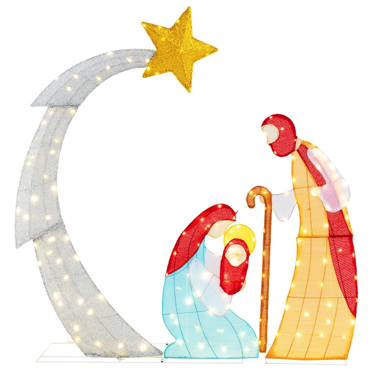 Transform your space into a sacred sanctuary with our captivating Nativity Display. Featuring lifelike figures of Jesus, Mary, and Joseph, intricately crafted to showcase the holiness of the season, this set is illuminated by 140 warm white LED lights, exuding a cozy glow that radiates festive charm. Built to withstand outdoor elements with premium tinsel and metal construction, this display stands sturdy with 12 ground stakes and 10 zip ties, ensuring stability. Perfect for adding a touch of holiday magic to your home or yard, it spreads joy and cheer while captivating all who behold its beauty. Sacred Serenity Unveiled: featuring lifelike figures of Jesus, Mary, and Joseph, finely crafted to highlight the holy nature of the holiday. The illuminating Star of Bethlehem adds an extra touch of warmth and inspiration, creating a sacred ambiance for your home or yard that will enchant all who see it. Enchanting Glow Extravaganza: emitting a cozy and inviting glow, these warm white LED lights bring a festive cheer to your holiday display. With energy-saving features, these lights shine brightly, spreading joy and light throughout the festive season, creating a mesmerizing atmosphere for all to enjoy. Weather-Defiant Wonder: constructed from premium tinsel and metal, this nativity set is resistant to water, wind, snow, and sun exposure. The sturdy design ensures it remains a centerpiece of your outdoor holiday display for years to come, shining brightly even in challenging weather conditions. Stability Beyond Measures: for high stability, this Christmas decoration includes 10 zip ties and 12 ground stakes to securely anchor it in place. The sturdy metal base ensures the nativity scene maintains its elegant posture, standing tall and proud in your yard or garden, exuding a sense of peace and tranquility. Festive Magic Unleashed: suitable for a variety of settings, this lighted nativity scene is ideal for bringing a festive atmosphere to your home or yard. Spread holiday cheer to all who visit with this charming display, creating a warm and welcoming environment that captures the true spirit of the season.