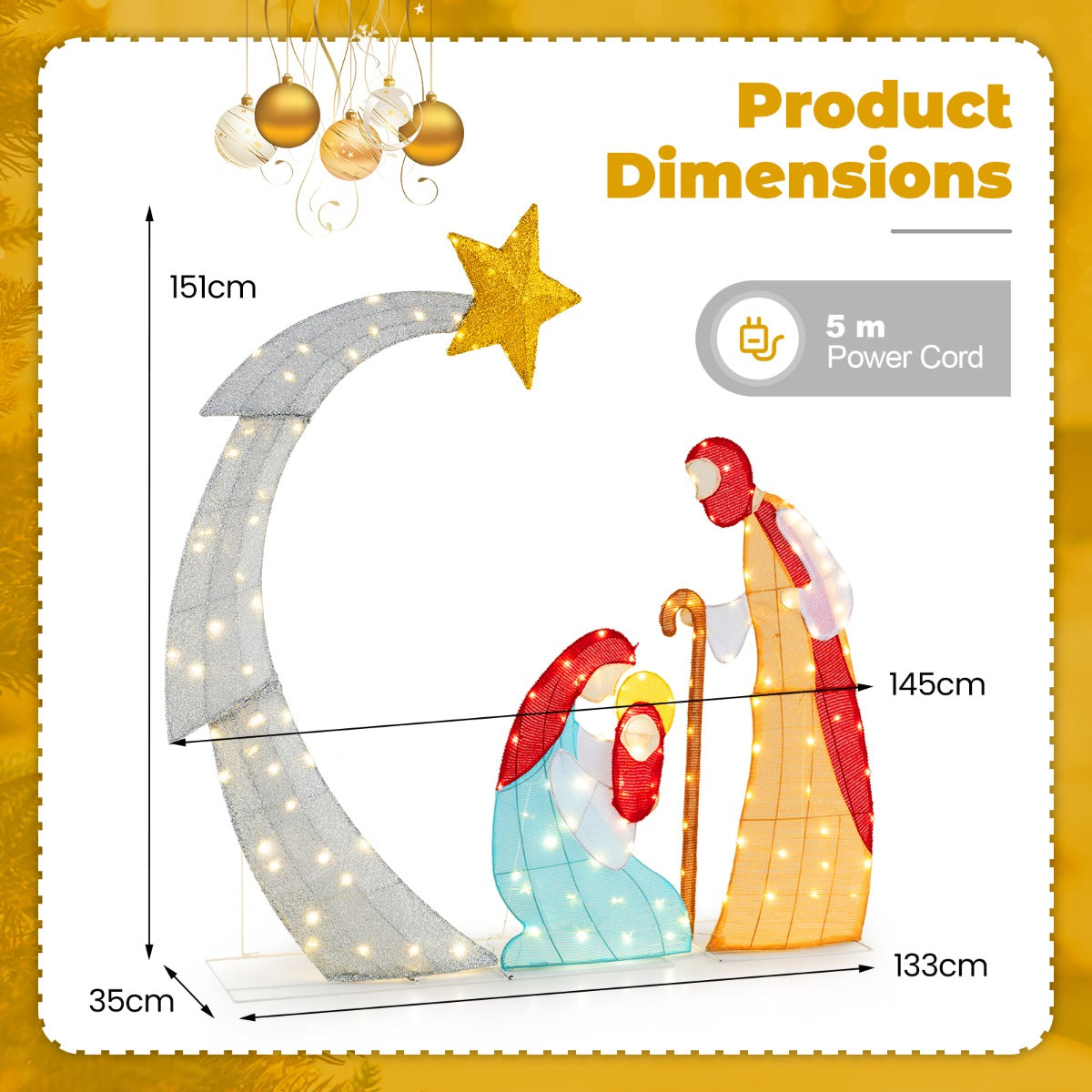 Colour: As Picture Shows Material: Tinsel, Metal Overall Dimension: 145 x 151 cm (L x H) Dimension of Base: 133 x 35 cm (L x W) Number of LED Lights: 140 Net Weight: 4 kg Cord Length: 5 m Box Qty:1(May vary by batch)Package Includes: 1 x Christmas Nativity Set 1 x Power Adapter 12 x Ground Stakes 10 x Zip Ties 1 x Instruction Manual