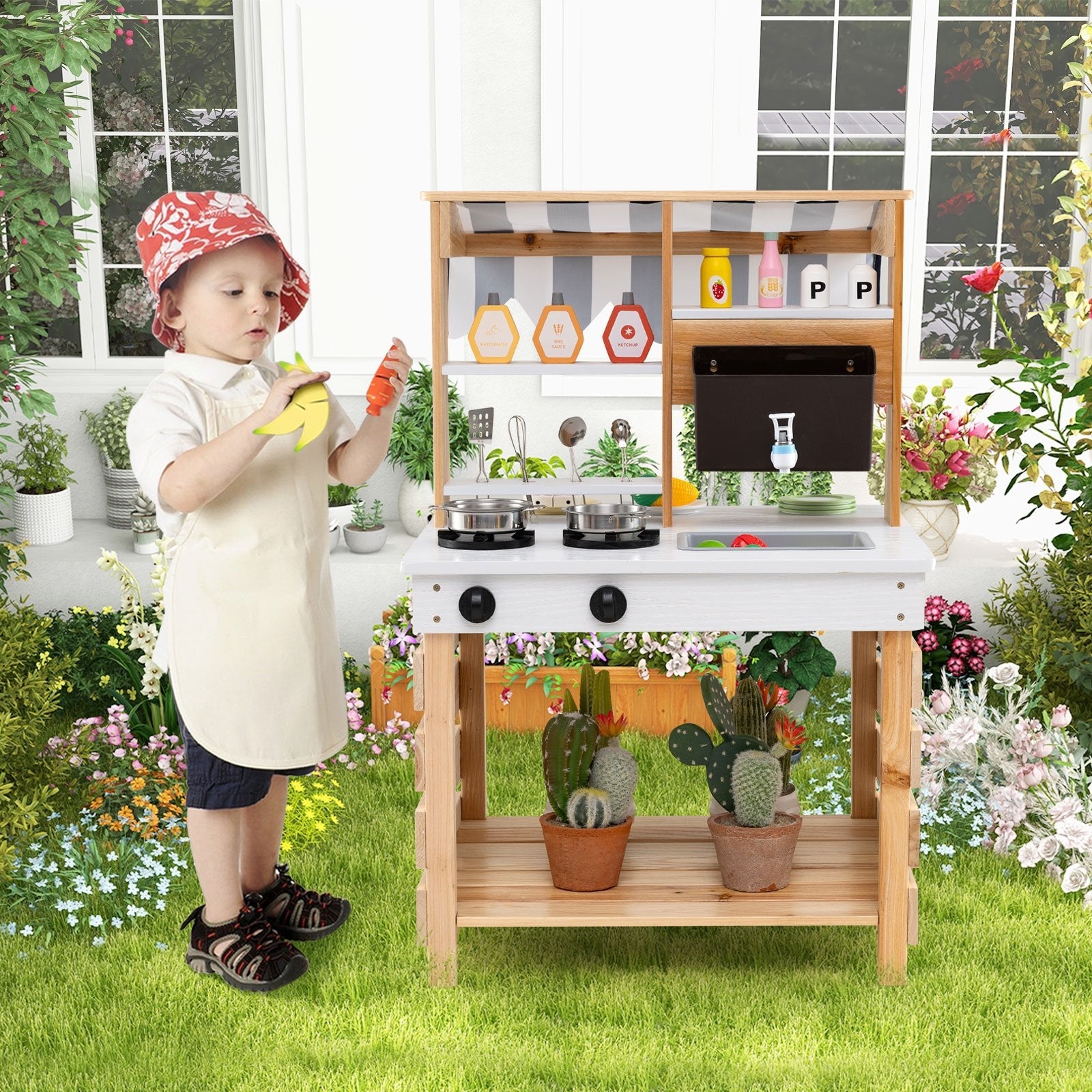 Expertly crafted from splinter-free, BPA-free fir wood, our mud kitchen playset ensures safety and enduring fun. Your kids can explore their creativity with the dual cooking stove, the clicking rotary knobs, the removable sink, the faucet and water box, the included kitchenware, and the shaded grocery stand. With built-in shelves, slots, and hooks, the playset cultivates the habit of organizing. Spark endless inspiration and fun with our mud kitchen for kids! Double-Sided Design: Our 2-in-1 playset offers a dual experience, acting as both a kitchen and a grocery stand for inspiring pretend play. Kids above 3 can unleash their creativity in serving mud dishes and develop social skills playing with their friends. Quality Materials: Safety is our top priority. Our BPA-free kitchen playset is crafted with natural fir wood and finished with water-based paints. The surface is splinter-free, and the corners are rounded to prevent injuries. Realistic Features: To add a touch of realism to your little ones’ make-believe kitchen, the mud kitchen playset features double stoves with clicking rotary knobs. The water box and faucet are also usable for kids to have fun with water. Cool Shading and Tidy up: With a vibrant Oxford cloth canopy, your kids can stay away from the sun during play. There are plenty of storage shelves, hooks, and slots for kids to organize their play areas, and the sink is removable for thorough cleaning. Wonderful Gift: Complete with pots, pans, and a variety of kitchen utensils, this double-sided mud kitchen is a perfect gift for birthdays or Christmas. The fading resistant playset stays in its optimal shape for years of interactive play and learning.